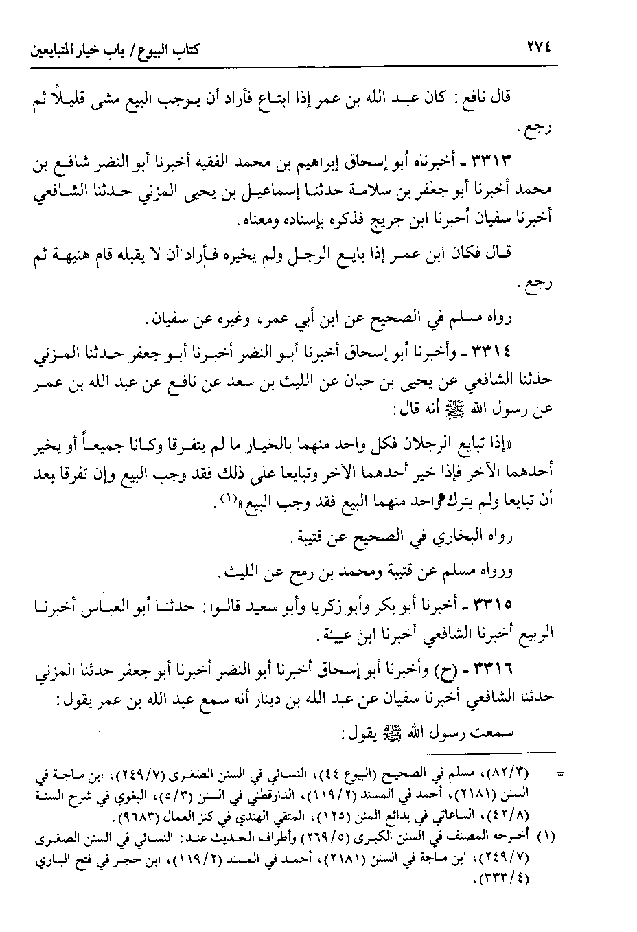 3314 - وأخبرنا أبو إسحاق أخبرنا أبو النضر أخبرنا أبو جعفر حدثنا المزني حدثنا الشافعي عن يحيى بن حبان عن الليث بن سعد عن نافع عن عبد الله بن عمر عن رسول الله صلى الله عليه وسلم أنه قال إذا تبايع الرجلان فكل واحد منهما بالخيار ما لم يتفرقا وكانا جميعاً أو يخير أحدهما الآخر فإذا خير أحدهما الآخر وتبايعا على ذلك فقد وجب البيع وإن تفرقا بعد أن تبايعا ولم يترك واحد منهما البيع فقد وجب البيع.