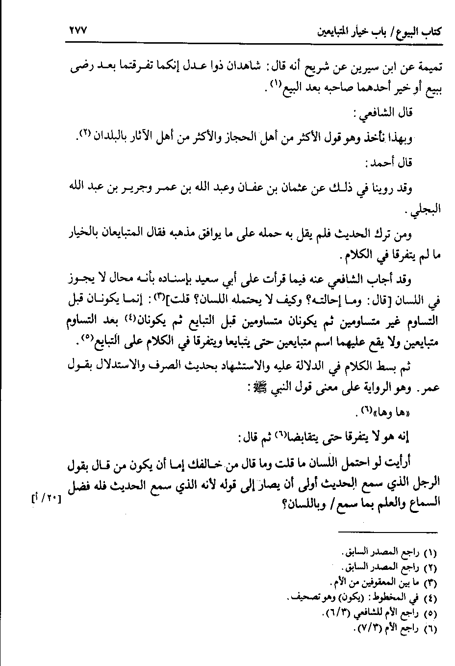 وقد أجاب الشافعي عنه فيما قرأت على أبي سعيد بإسناده بأنه محال لا يجوز في اللسان قال : وما إحالته ؟ وكيف لا يحتمله اللسان ؟ قلت : إنما يكونان قبل التساوم غير متساومين ثم يكونان متساومين قبل التبايع ثم يكونان بعد التساوم متبايعين ولا يقع عليهما اسم متبايعين حتى يتبايعا ويتفرقا في الكلام على التبايع.