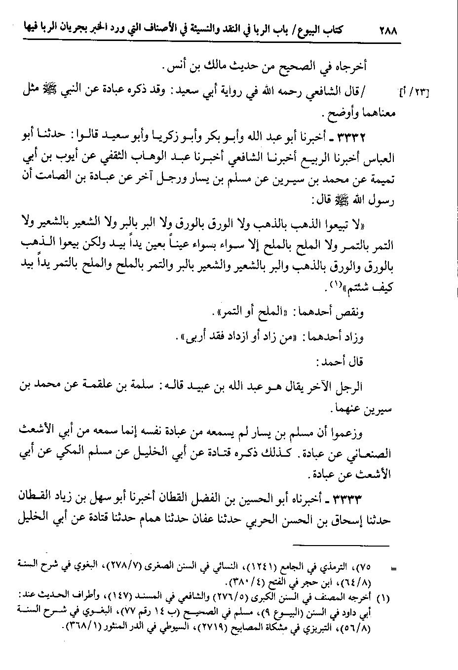 3332 - أخبرنا أبو عبد الله وأبو بكر وأبو زكريا وأبو سعيد قالوا : حدثنا أبو العباس أخبرنا الربيع أخبرنا الشافعي أخبرنا عبد الوهاب الثقفي عن أيوب بن أبي تميمة عن محمد بن سيرين عن مسلم بن يسار ورجل آخر عن عبادة بن الصامت أن رسول الله صلى الله عليه وسلم قال لا تبيعوا الذهب بالذهب ولا الورق بالورق ولا البر بالبر ولا الشعير بالشعير ولا التمر بالتمر ولا الملح بالملح إلا سواء بسواء عيناً بعين يداً بيد ولكن بيعوا الذهب بالورق والورق بالذهب والبر بالشعير والشعير بالبر والتمر بالملح والملح بالتمر يداً بيد كيف شئتم.