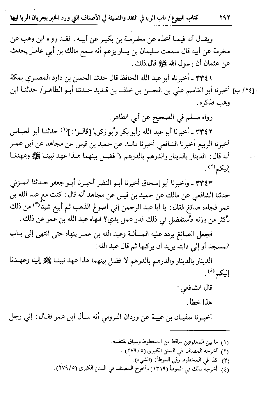 3342 - أخبرنا أبو عبد الله وأبو بكر وأبو زكريا قالوا : حدثنا أبو العباس أخبرنا الربيع أخبرنا الشافعي أخبرنا مالك عن حميد بن قيس عن مجاهد عن ابن عمر أنه قال : الدينار بالدينار والدرهم بالدرهم لا فضل بينهما هذا عهد نبينا صلى الله عليه وسلم وعهدنا إليكم.
