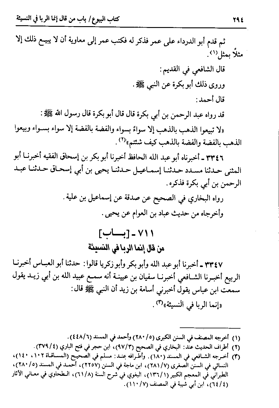 3347 - أخبرنا أبو عبد الله وأبو بكر وأبو زكريا قالوا : حدثنا أبو العباس أخبرنا الربيع أخبرنا الشافعي أخبرنا سفيان بن عيينة أنه سمع عبيد الله بن أبي زيد يقول سمعت ابن عباس يقول أخبرني أسامة بن زيد أن النبي صلى الله عليه وسلم قال إنما الربا في النسيئة.