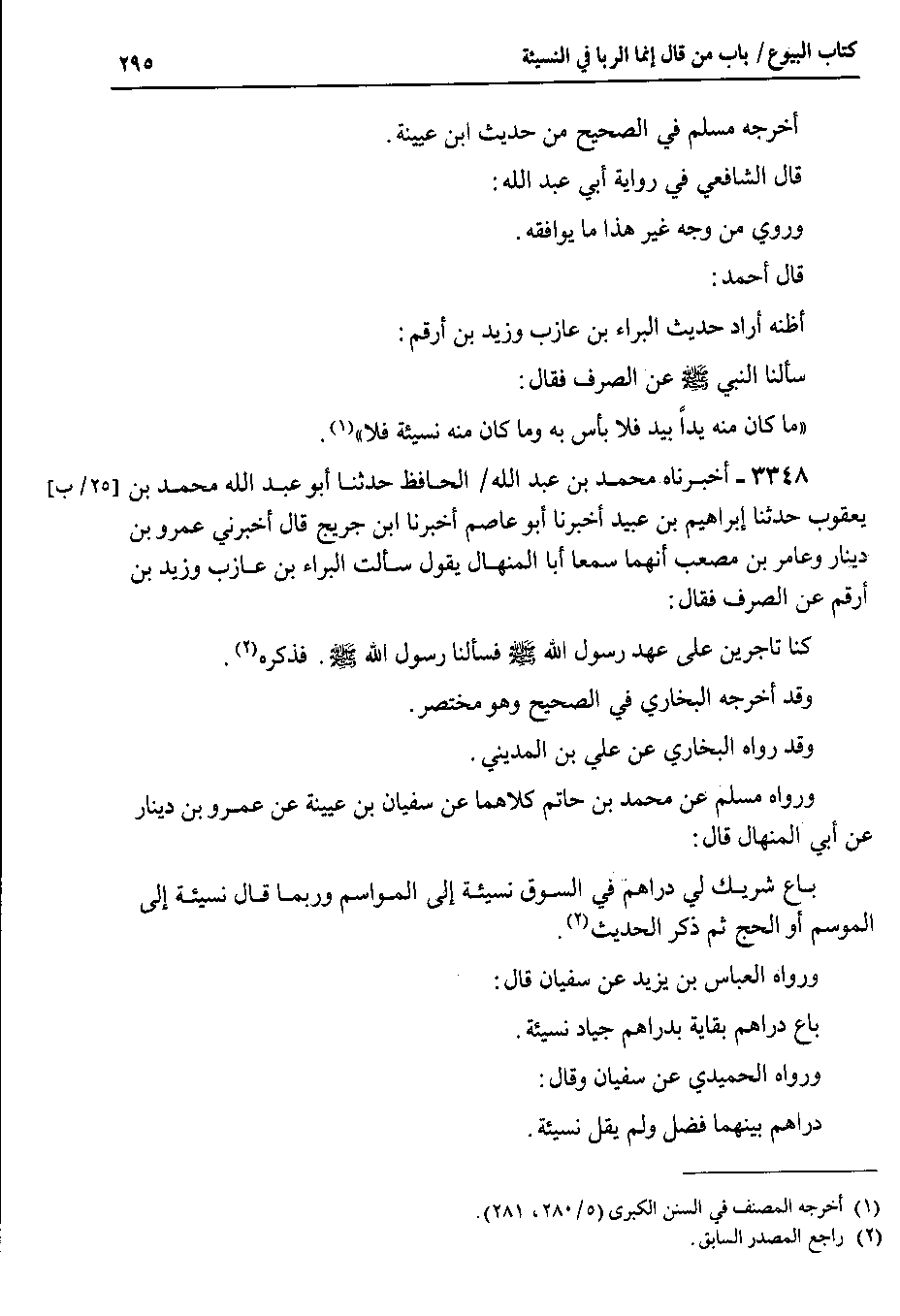 ورواه مسلم عن محمد بن حاتم كلاهما عن سفيان بن عيينة عن عمرو بن دينار عن أبي المنهال قال باع شريك لي دراهم في السوق نسيئة إلى المواسم وربما قال نسيئة إلى الموسم أو الحج ثم ذكر الحديث.