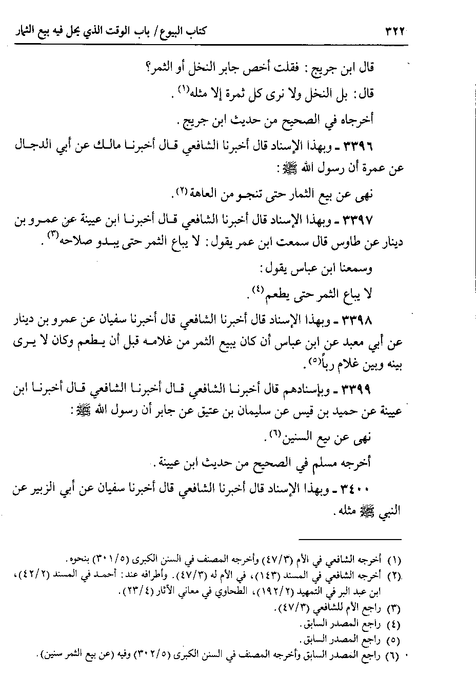 3397 - وبهذا الإسناد قال أخبرنا الشافعي قال أخبرنا ابن عيينة عن عمرو بن دينار عن طاووس قال سمعت ابن عمر يقول : لا يباع الثمر حتى يبدو صلاحه.