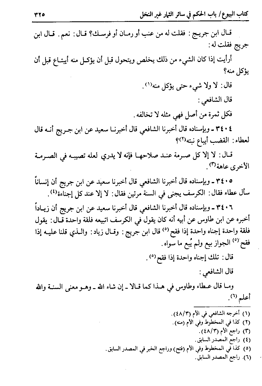 3404 - وبإسناده قال أخبرنا الشافعي قال أخبرنا سعيد عن ابن جريج أنه قال لعطاء : القضب أيباع نبته ؟ قال : لا إلا كل صرمة عند صلاحها فإنه لا يدري لعله تصيبه في الصرمة الأخرى عاهة.
