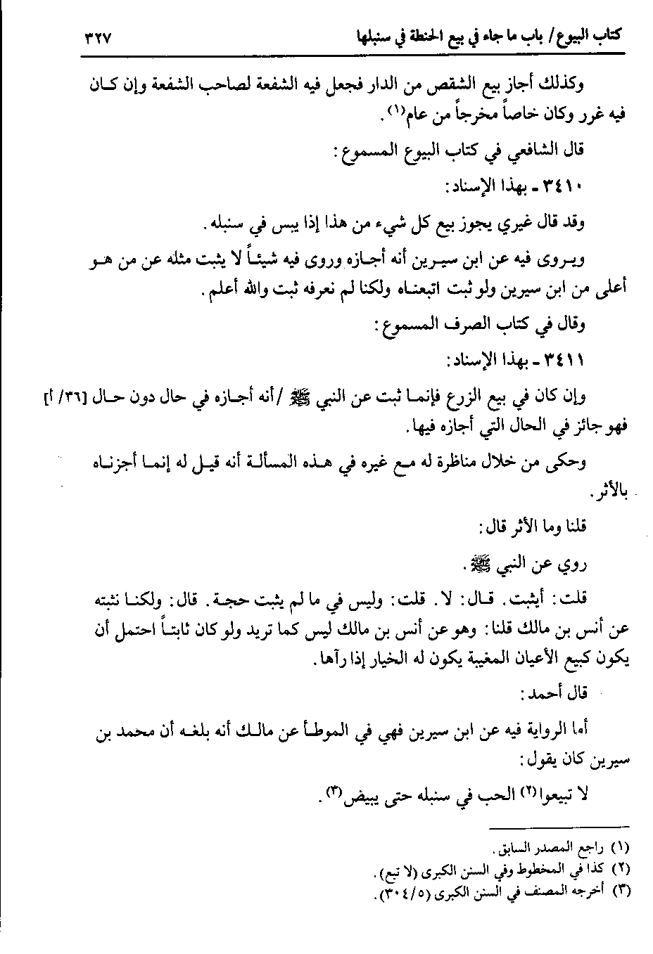 قال أحمد أما الرواية فيه عن ابن سيرين فهي في الموطأ عن مالك أنه بلغه أن محمد بن سيرين كان يقول لا تبيعوا الحب في سنبله حتى يبيض.