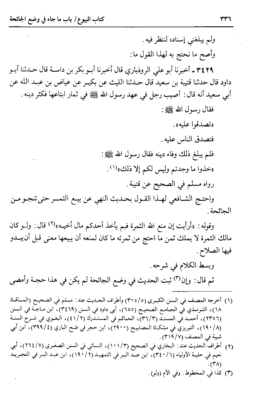 وأصح ما نحتج به لهذا القول ما 3429 - أخبرنا أبو علي الروذباري قال أخبرنا أبو بكر بن داسة قال حدثنا أبو داود قال حدثنا قتيبة بن سعيد قال حدثنا الليث عن بكير عن عياض بن عبد الله عن أبي سعيد أنه قال : أصيب رجل في عهد رسول الله صلى الله عليه وسلم في ثمار ابتاعها فكثر دينه.