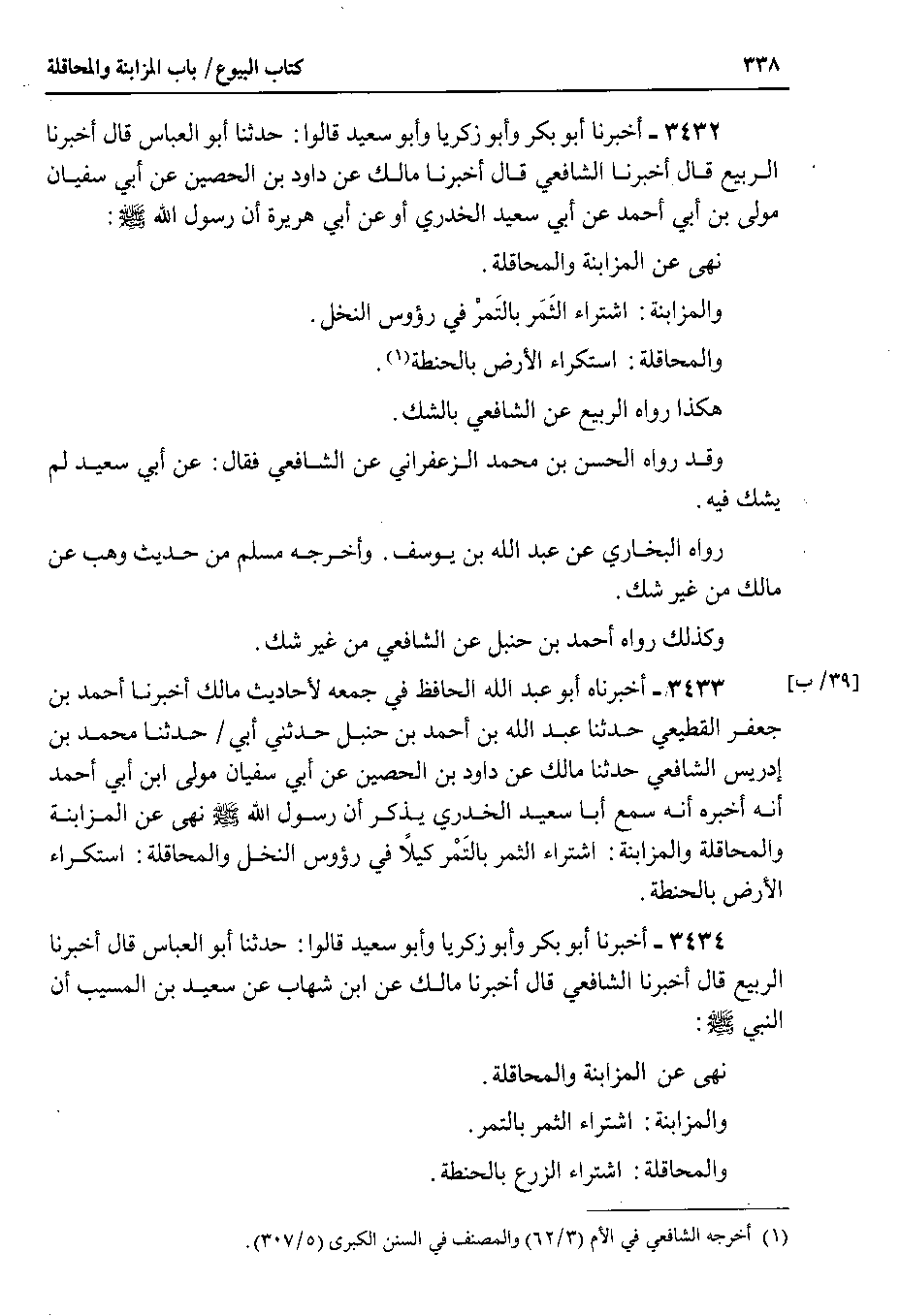 3433 - أخبرناه أبو عبد الله الحافظ في جمعه لأحاديث مالك أخبرنا أحمد بن جعفر القطيعي حدثنا عبد الله بن أحمد بن حنبل حدثني أبي حدثنا محمد بن إدريس الشافعي حدثنا مالك عن داود بن الحصين عن أبي سفيان مولى ابن أبي أحمد أنه أخبره أنه سمع أبا سعيد الخدري يذكر أن رسول الله صلى الله عليه وسلم نهى عن المزابنة والمحاقلة والمزابنة : اشتراء الثمر بالتمر كيلاً في رؤوس النخل والمحاقلة : استكراء الأرض بالحنطة.