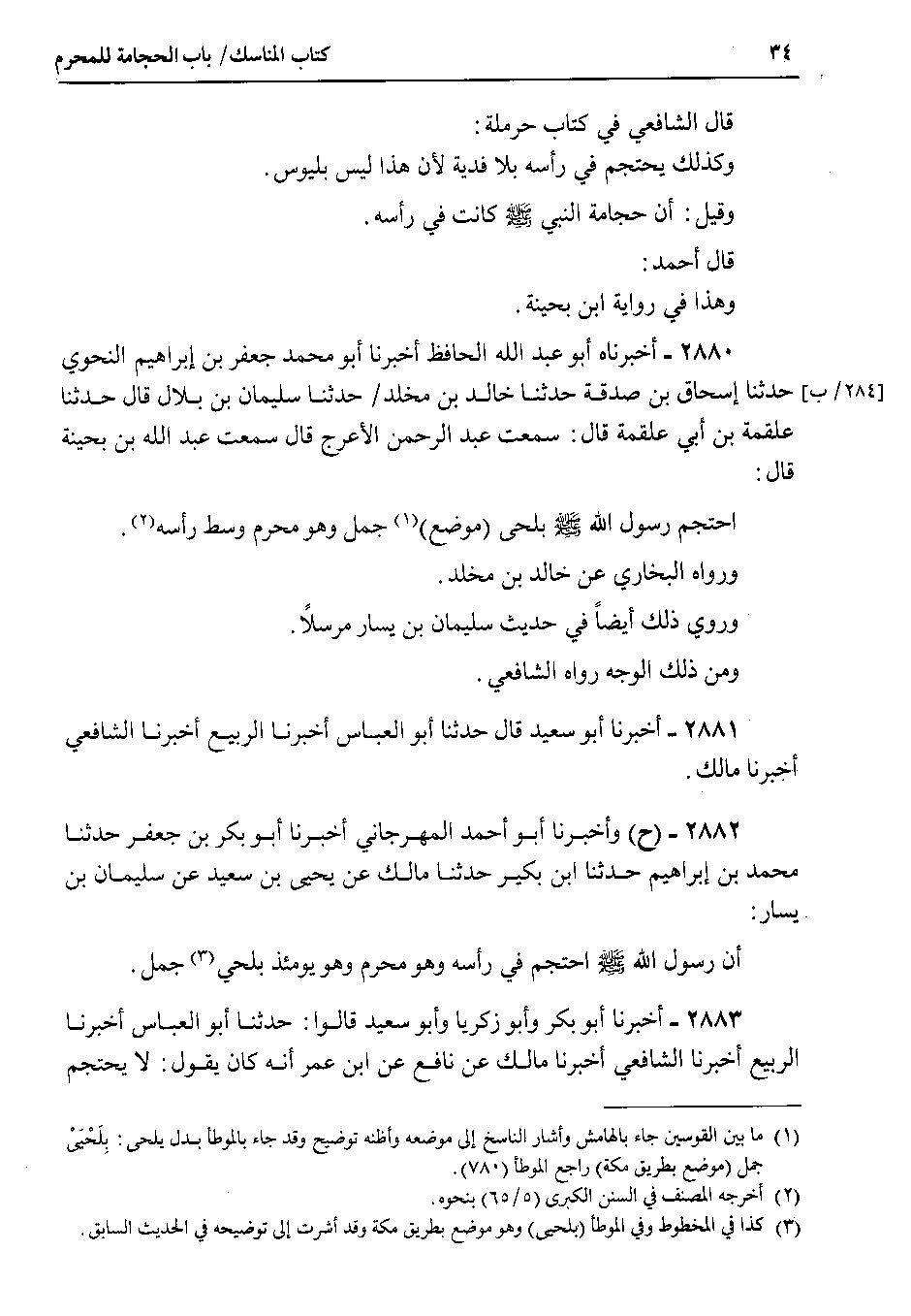 2882 - ( ح ) وأخبرنا أبو أحمد المهرجاني أخبرنا أبو بكر بن جعفر حدثنا محمد بن إبراهيم حدثنا ابن بكير حدثنا مالك عن يحيى بن سعيد عن سليمان بن يسار : أن رسول الله صلى الله عليه وسلم احتجم في رأسه وهو محرم وهو يومئذ بلحي جمل.