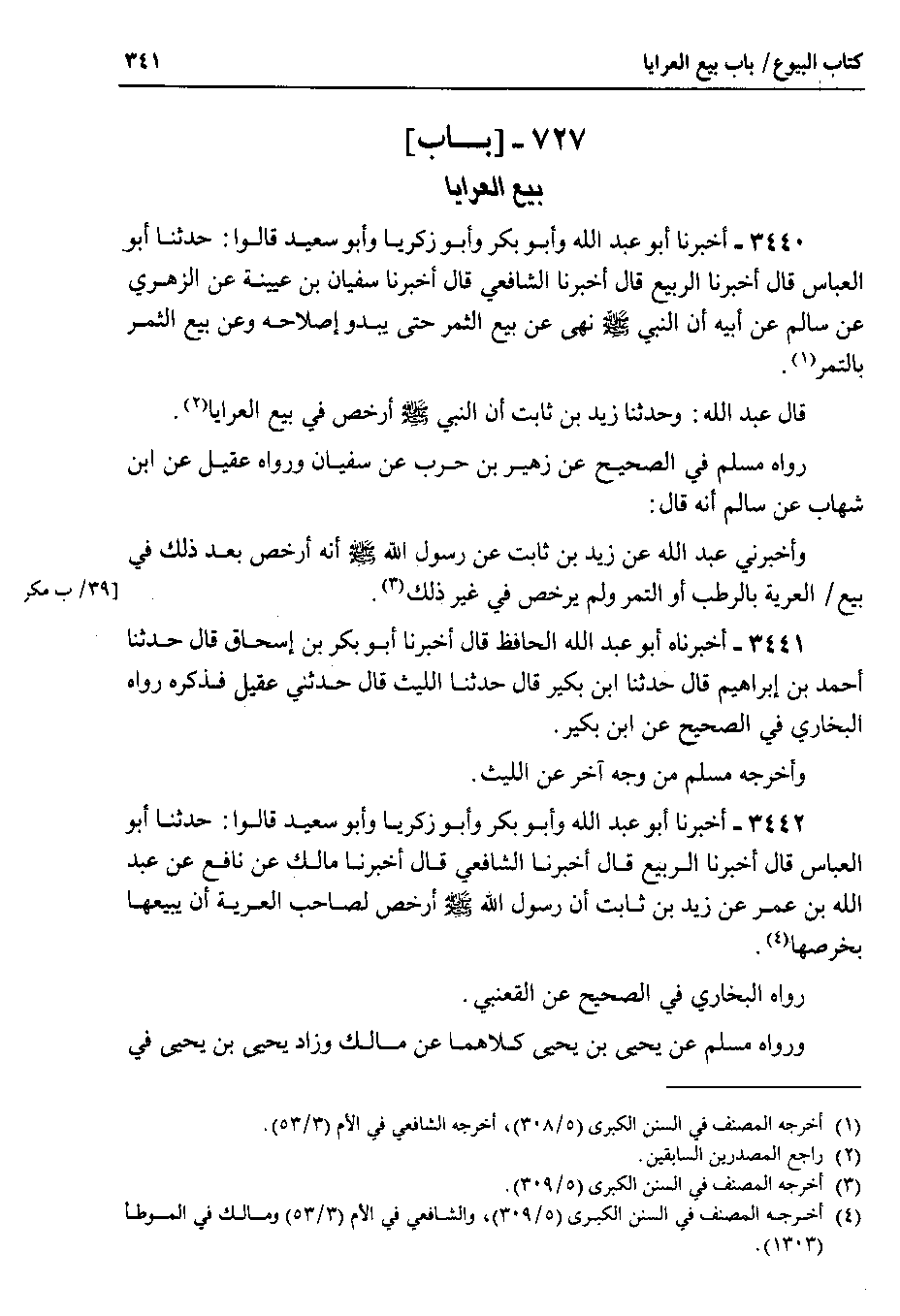 3442 - أخبرنا أبو عبد الله وأبو بكر وأبو زكريا وأبو سعيد قالوا : حدثنا أبو العباس قال أخبرنا الربيع قال أخبرنا الشافعي قال أخبرنا مالك عن نافع عن عبد الله بن عمر عن زيد بن ثابت أن رسول الله صلى الله عليه وسلم أرخص لصاحب العرية أن يبيعها بخرصها.