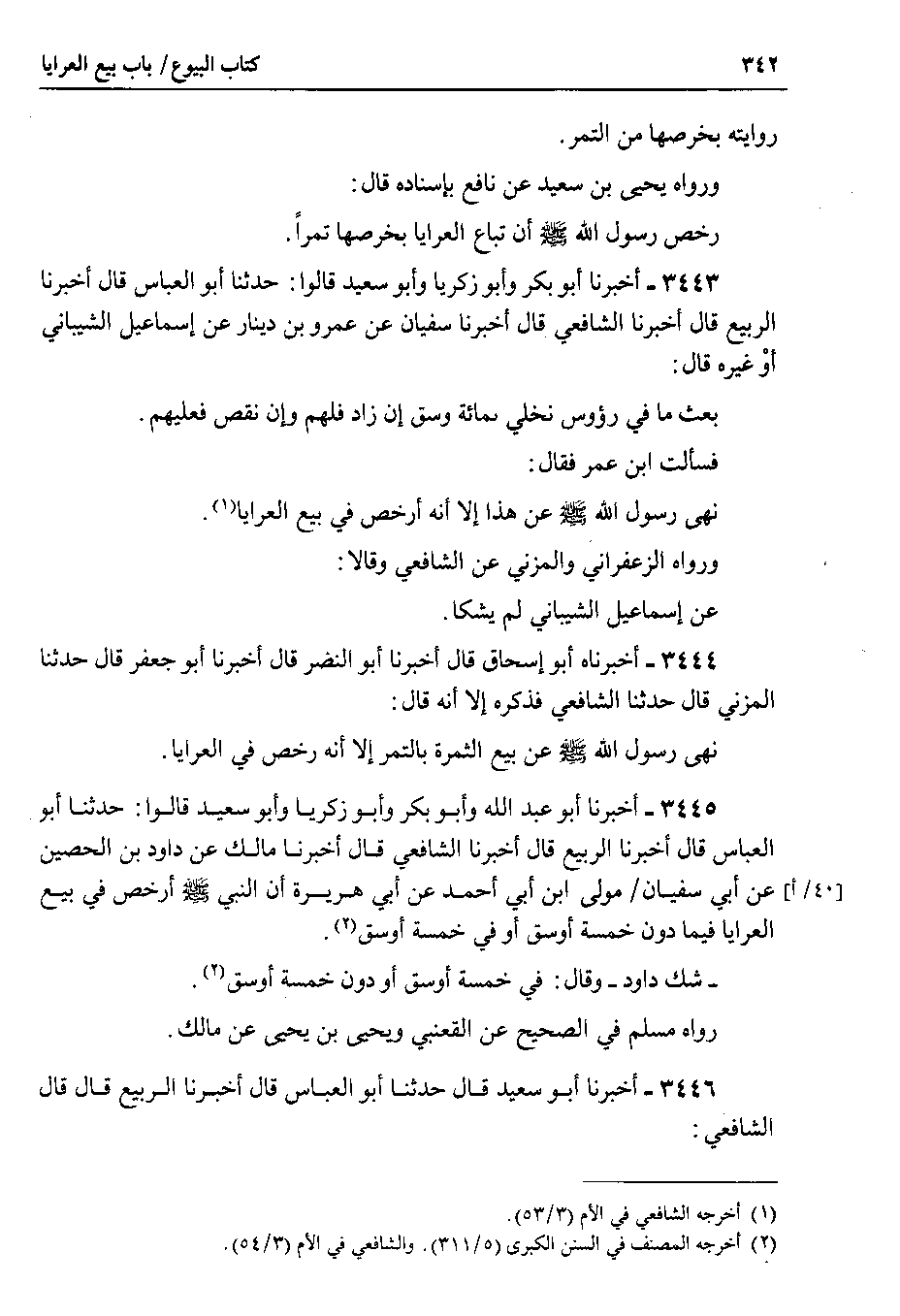 3443 - أخبرنا أبو بكر وأبو زكريا وأبو سعيد قالوا : حدثنا أبو العباس قال أخبرنا الربيع قال أخبرنا الشافعي قال أخبرنا سفيان عن عمرو بن دينار عن إسماعيل الشيباني أو غيره قال بعث ما في رؤوس نخلي بمِئَة وسق إن زاد فلهم وإن نقص فعليهم.