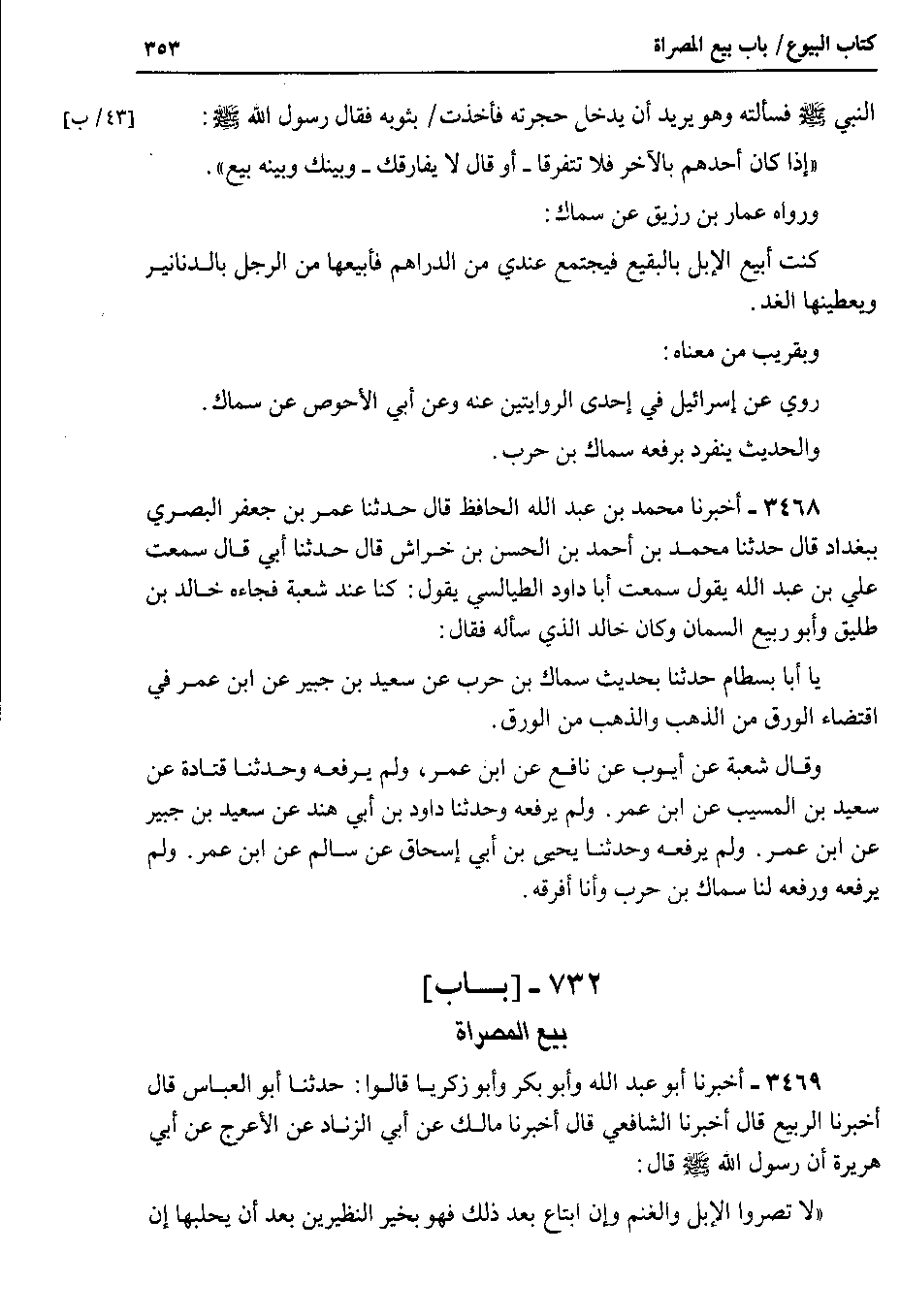 3469 - أخبرنا أبو عبد الله وأبو بكر وأبو زكريا قالوا : حدثنا أبو العباس قال أخبرنا الربيع قال أخبرنا الشافعي قال أخبرنا مالك عن أبي الزناد عن الأعرج عن أبي هريرة أن رسول الله صلى الله عليه وسلم قال لا تصروا الإبل والغنم وإن ابتاع بعد ذلك فهو بخير النظيرين بعد أن يحلبها إن
