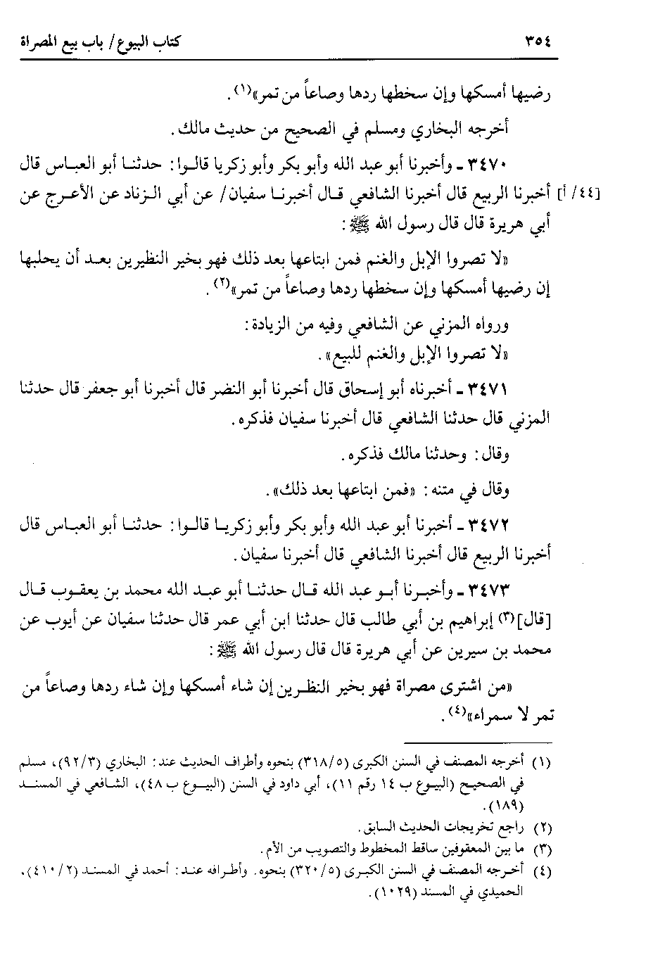 3470 - وأخبرنا أبو عبد الله وأبو بكر وأبو زكريا قالوا : حدثنا أبو العباس قال أخبرنا الربيع قال أخبرنا الشافعي قال أخبرنا سفيان عن أبي الزناد عن الأعرج عن أبي هريرة قال قال رسول الله صلى الله عليه وسلم لا تصروا الإبل والغنم فمن ابتاعها بعد ذلك فهو بخير النظيرين بعد أن يحلبها إن رضيها أمسكها وإن سخطها ردها وصاعاً من تمر.