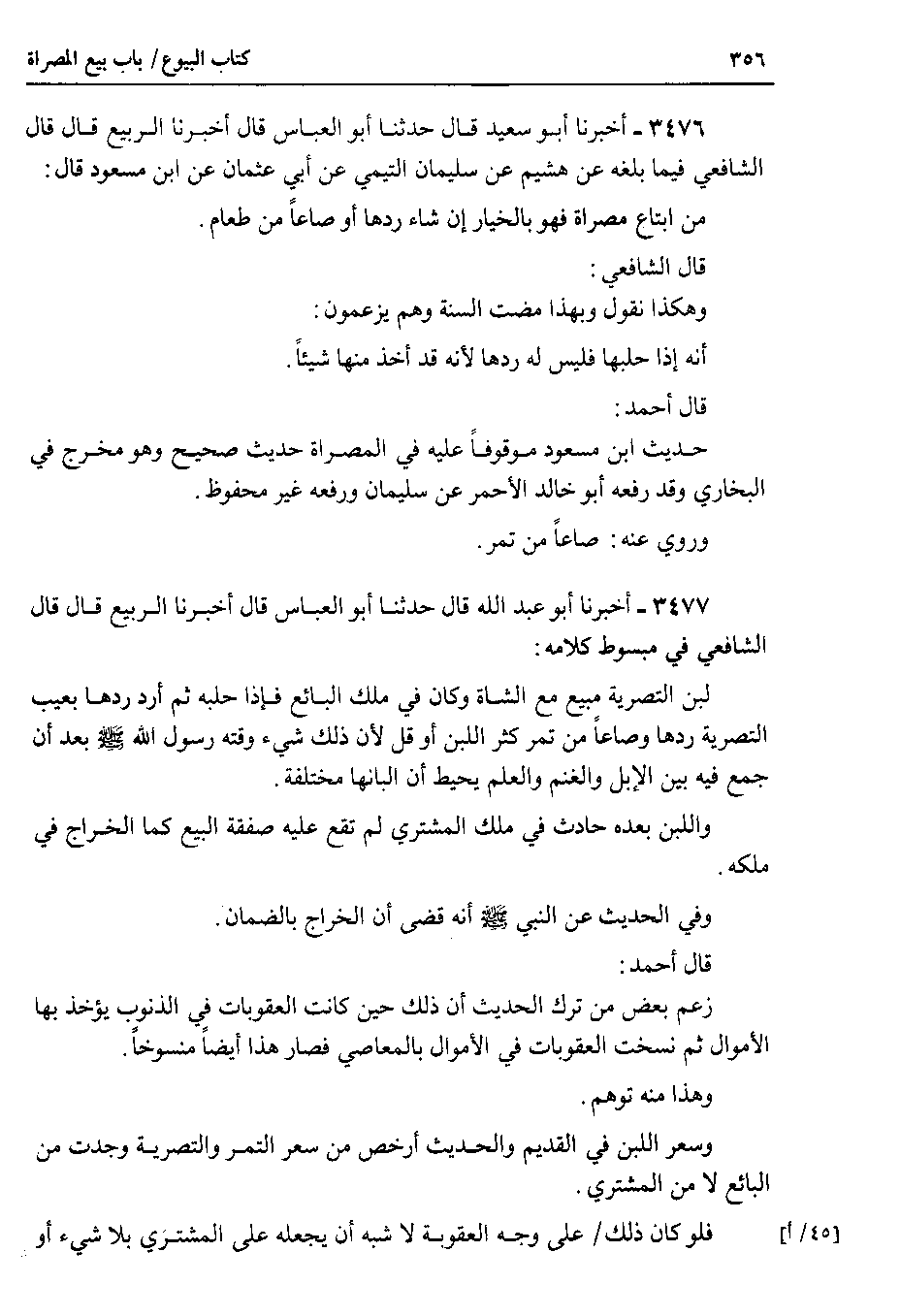 3476 - أخبرنا أبو سعيد قال حدثنا أبو العباس قال أخبرنا الربيع قال قال الشافعي فيما بلغه عن هشيم عن سليمان التيمي عن أبي عثمان عن ابن مسعود قال من ابتاع مصراة فهو بالخيار إن شاء ردها أو صاعاً من طعام.
