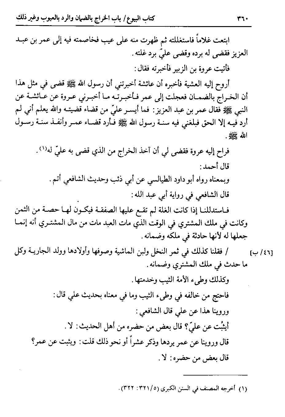 فأتيت عروة بن الزبير فأخبرته فقال أروح إليه العشية فأخبره أن عائشة أخبرتني أن رسول الله صلى الله عليه وسلم قضى في مثل هذا أن الخراج بالضمان فعجلت إلى عمر فأخبرته ما أخبرني عروة عن عائشة عن النبي صلى الله عليه وسلم فقال عمر بن عبد العزيز : فما أيسر علي من قضاء قضيته والله يعلم أني لم أرد فيه إلا الحق فبلغني فيه سنة رسول الله صلى الله عليه وسلم فأرد قضاء عمر وأنفذ سنة رسول الله صلى الله عليه وسلم.