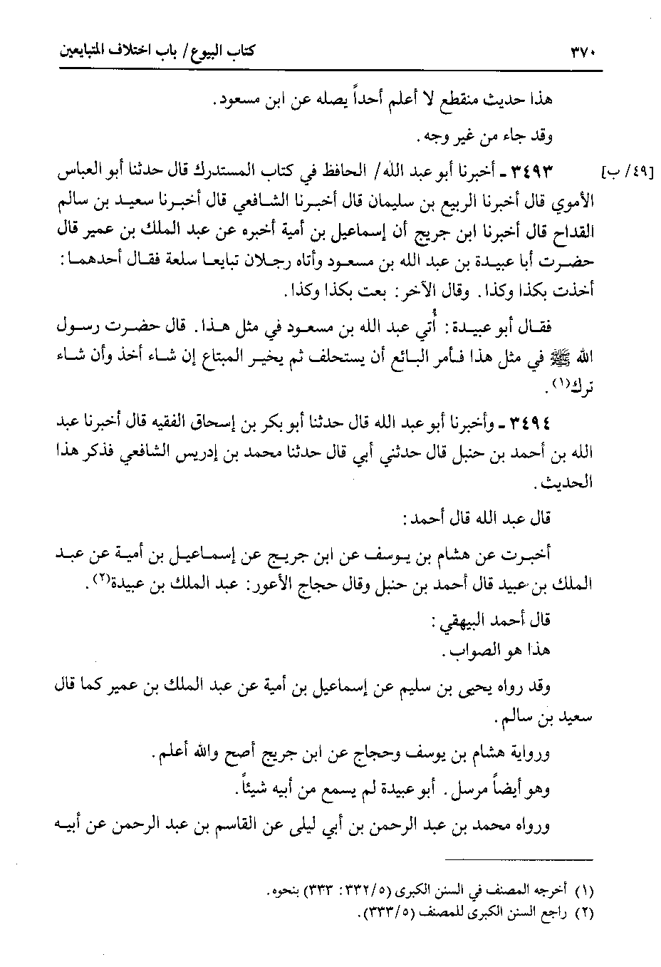 3493 - أخبرنا أبو عبد الله الحافظ في كتاب المستدرك قال حدثنا أبو العباس الأموي قال أخبرنا الربيع بن سليمان قال أخبرنا الشافعي قال أخبرنا سعيد بن سالم القداح قال أخبرنا ابن جريج أن إسماعيل بن أمية أخبره عن عبد الملك بن عمير قال حضرت أبا عبيدة بن عبد الله بن مسعود وأتاه رجلان تبايعا سلعة فقال أحدهما : أخذت بكذا وكذا . وقال الآخر : بعت بكذا وكذا.