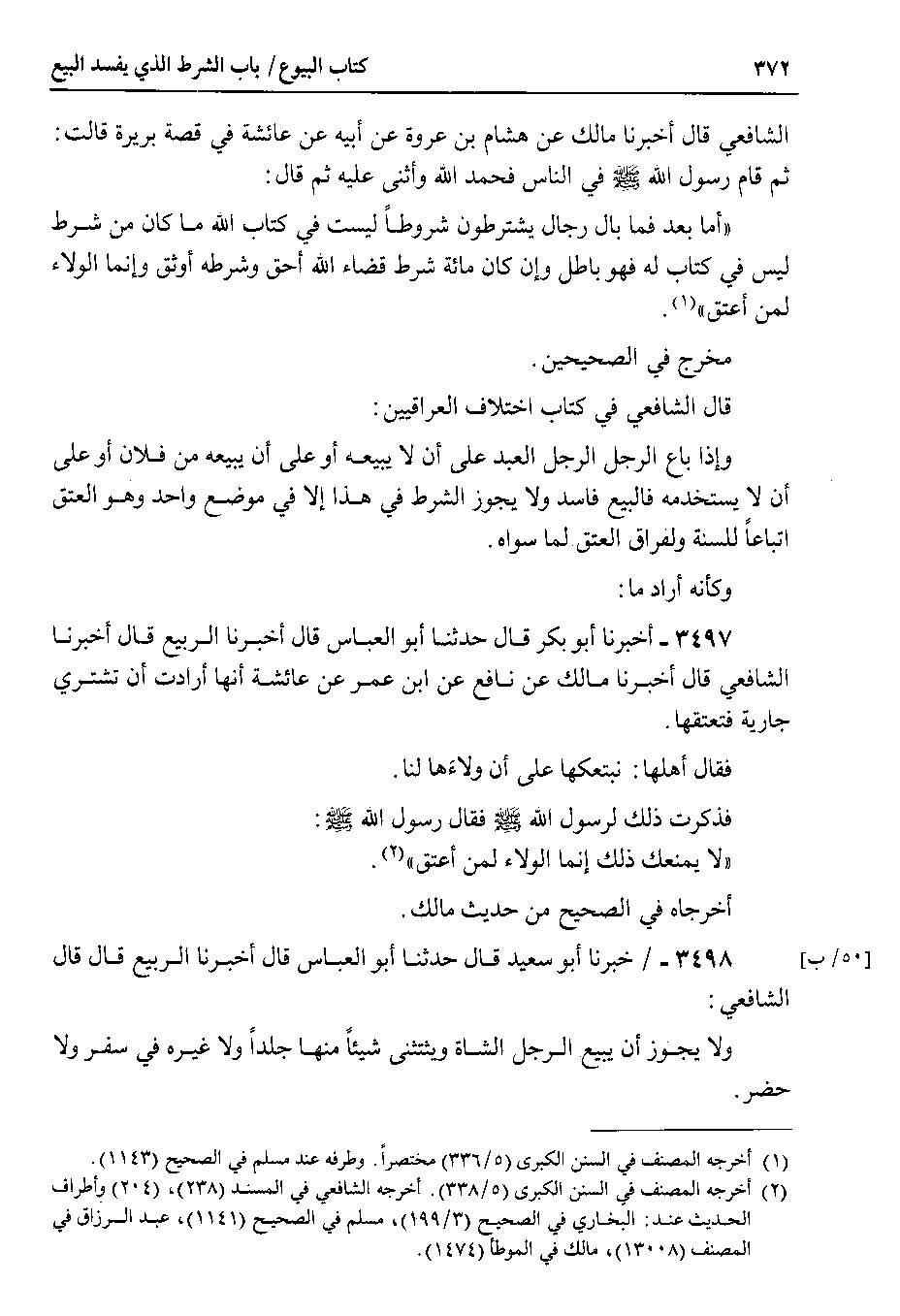 الشافعي قال أخبرنا مالك عن هشام بن عروة عن أبيه عن عائشة في قصة بربرة قالت : ثم قام رسول الله صلى الله عليه وسلم في الناس فحمد الله وأثنى عليه ثم قال أما بعد فما بال رجال يشترطون شروطاً ليست في كتاب الله ما كان من شرط ليس في كتاب له فهو باطل وإن كان مِئَة شرط قضاء الله أحق وشرطه أوثق وإنما الولاء لمن أعتق.