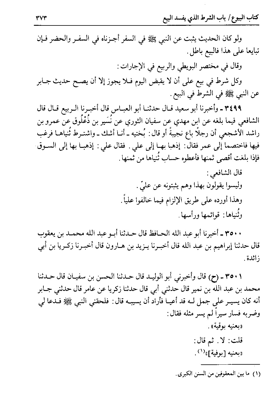 3501 - ( ح ) قال وأخبرني أبو الوليد قال حدثنا الحسن بن سفيان قال حدثنا محمد بن عبد الله بن نمير قال حدثني أبي قال حدثنا زكريا عن عامر قال حدثني جابر أنه كان يسير على جمل له قد أعيا فأراد أن يسيبه قال : فلحقني النبي صلى الله عليه وسلم فدعا لي وضربه فسار سيراً لم يسر مثله فقال بعنيه بوقية.