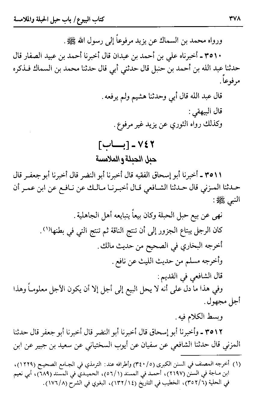 3511 - أخبرنا أبو إسحاق الفقيه قال أخبرنا أبو النضر قال أخبرنا أبو جعفر قال حدثنا المزني قال حدثنا الشافعي قال أخبرنا مالك عن نافع عن ابن عمر أن النبي صلى الله عليه وسلم نهى عن بيع حبل الحبلة وكان بيعاً يتبايعه أهل الجاهلية.