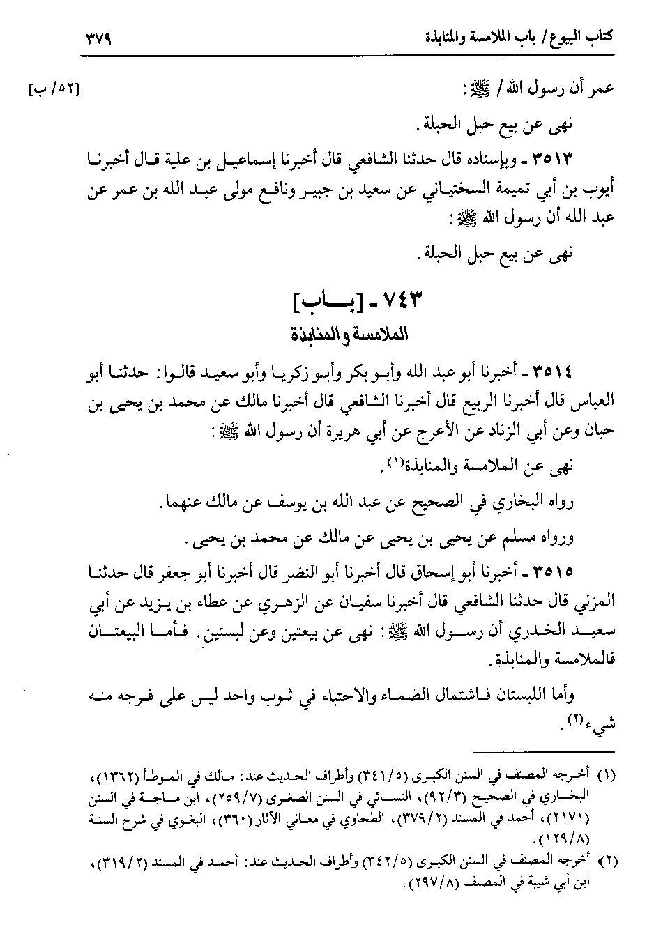 3513 - وبإسناده قال حدثنا الشافعي قال أخبرنا إسماعيل بن علية قال أخبرنا أيوب بن أبي تميمة السختياني عن سعيد بن جبير ونافع مولى عبد الله بن عمر عن عبد الله أن رسول الله صلى الله عليه وسلم نهى عن بيع حبل الحبلة.