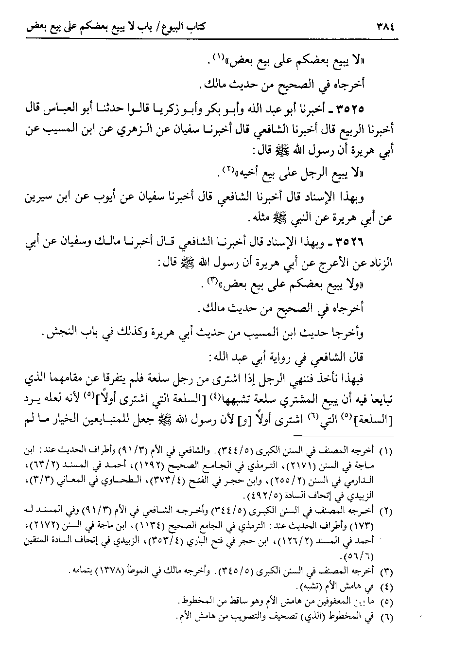 3526 - وبهذا الإسناد قال أخبرنا الشافعي قال أخبرنا مالك وسفيان عن أبي الزناد عن الأعرج عن أبي هريرة أن رسول الله صلى الله عليه وسلم قال ولا يبيع بعضكم على بيع بعض.