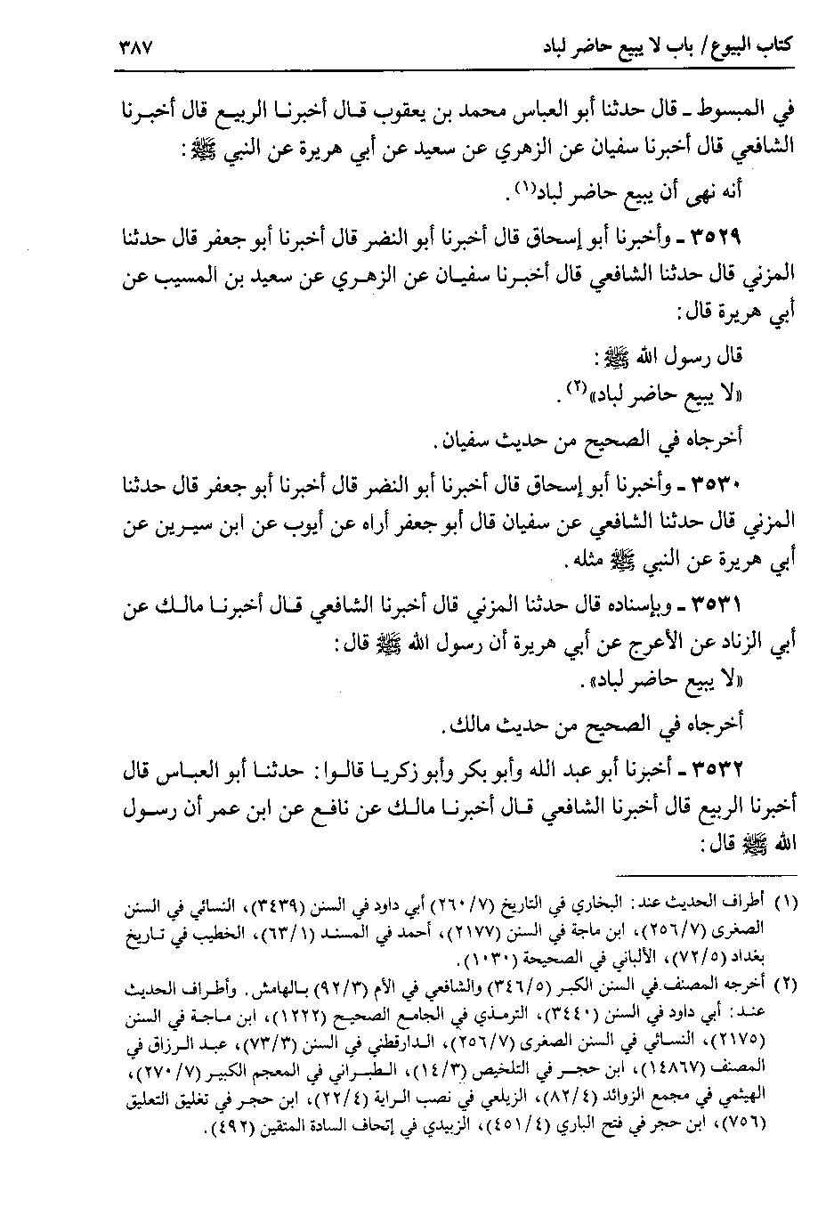 3531 - وبإسناده قال حدثنا المزني قال أخبرنا الشافعي قال أخبرنا مالك عن أبي الزناد عن الأعرج عن أبي هريرة أن رسول الله صلى الله عليه وسلم قال لا يبيع حاضر لباد.