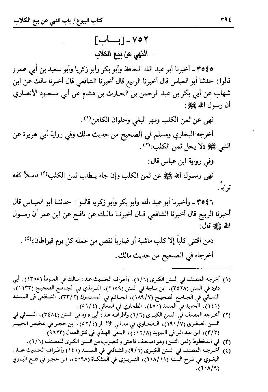 3546 - وأخبرنا أبو عبد الله وأبو بكر وأبو زكريا قالوا : حدثنا أبو العباس قال أخبرنا الربيع قال أخبرنا الشافعي قال أخبرنا مالك عن نافع عن ابن عمر أن رسول الله صلى الله عليه وسلم قال من اقتنى كلباً إلا كلب ماشية أو ضارياً نقص من عمله كل يوم قيراطان.