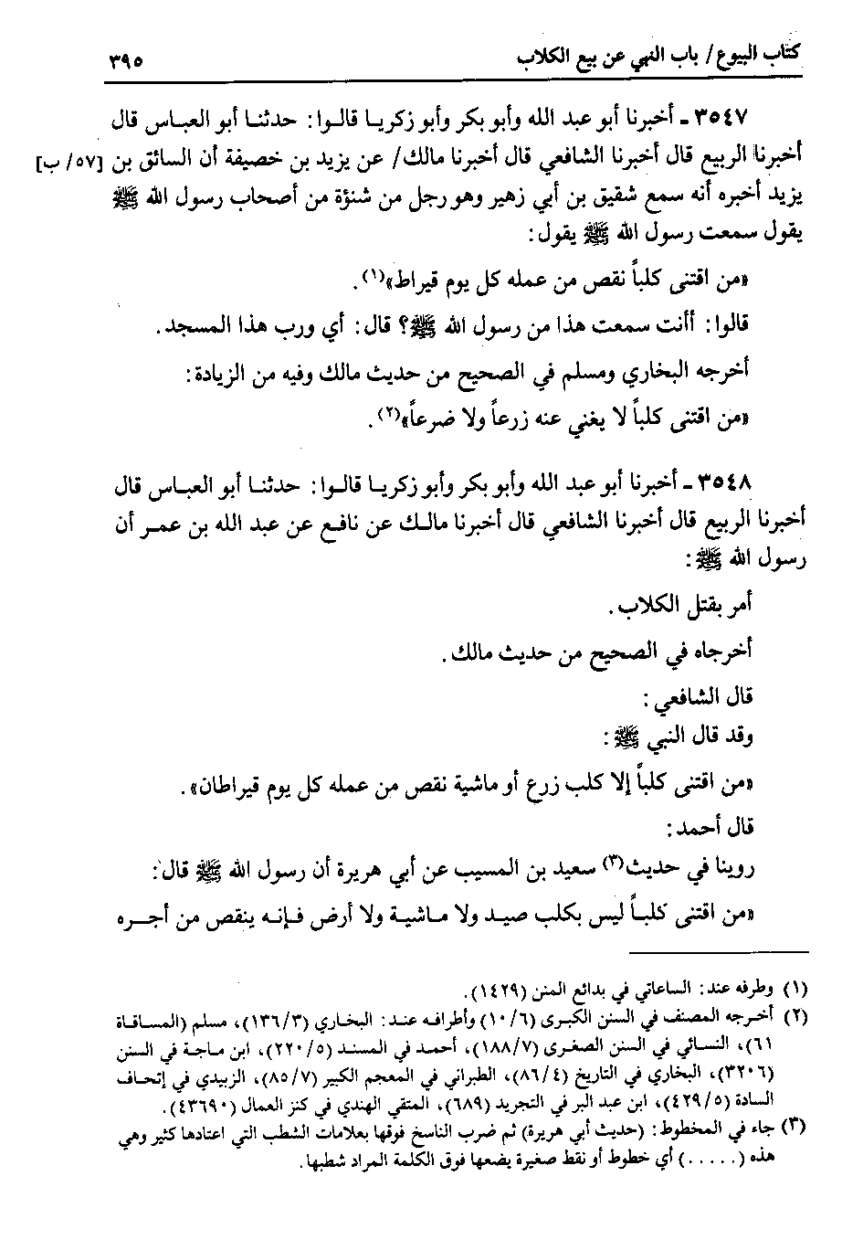 3547 - أخبرنا أبو عبد الله وأبو بكر وأبو زكريا قالوا : حدثنا أبو العباس قال أخبرنا الربيع قال أخبرنا الشافعي قال أخبرنا مالك عن يزيد بن خصيفة أن السائق بن يزيد أخبره أنه سمع شقيق بن أبي زهير وهو رجل من شنؤة من أصحاب رسول الله صلى الله عليه وسلم يقول سمعت رسول الله صلى الله عليه وسلم يقول من اقتنى كلباً نقص من عمله كل يوم قيراط.