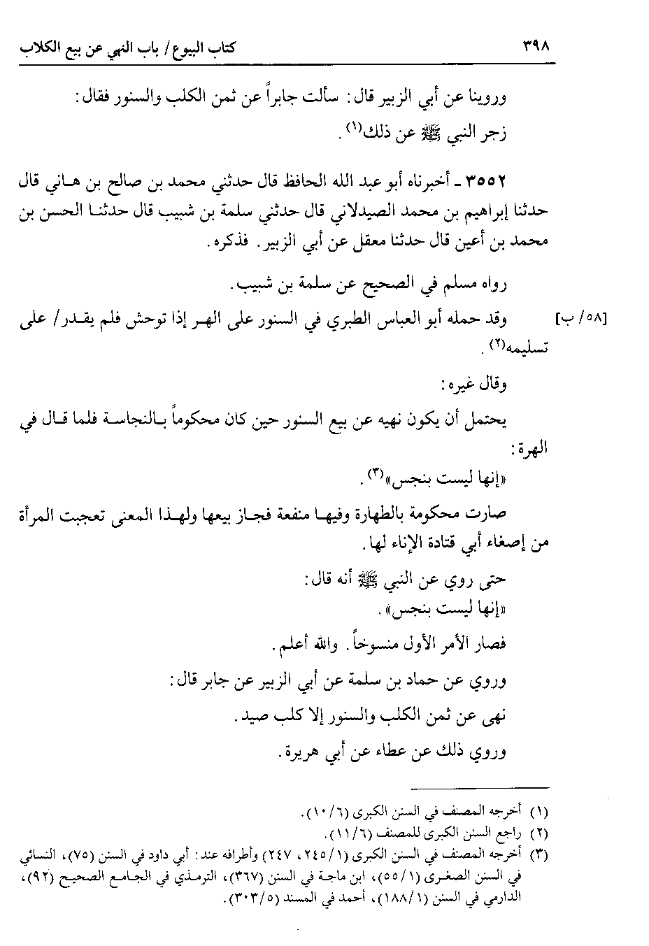 وروي عن حماد بن سلمة عن أبي الزبير عن جابر قال نهى عن ثمن الكلب والسنور إلا كلب صيد.