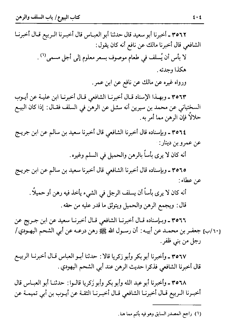 3563 - وبهذا الإسناد قال أخبرنا الشافعي قال أخبرنا ابن علية عن أيوب السختياني عن محمد بن سيرين أنه سئل عن الرهن في السلف فقال : إذا كان البيع حلالاً فإن الرهن مما أمر به.
