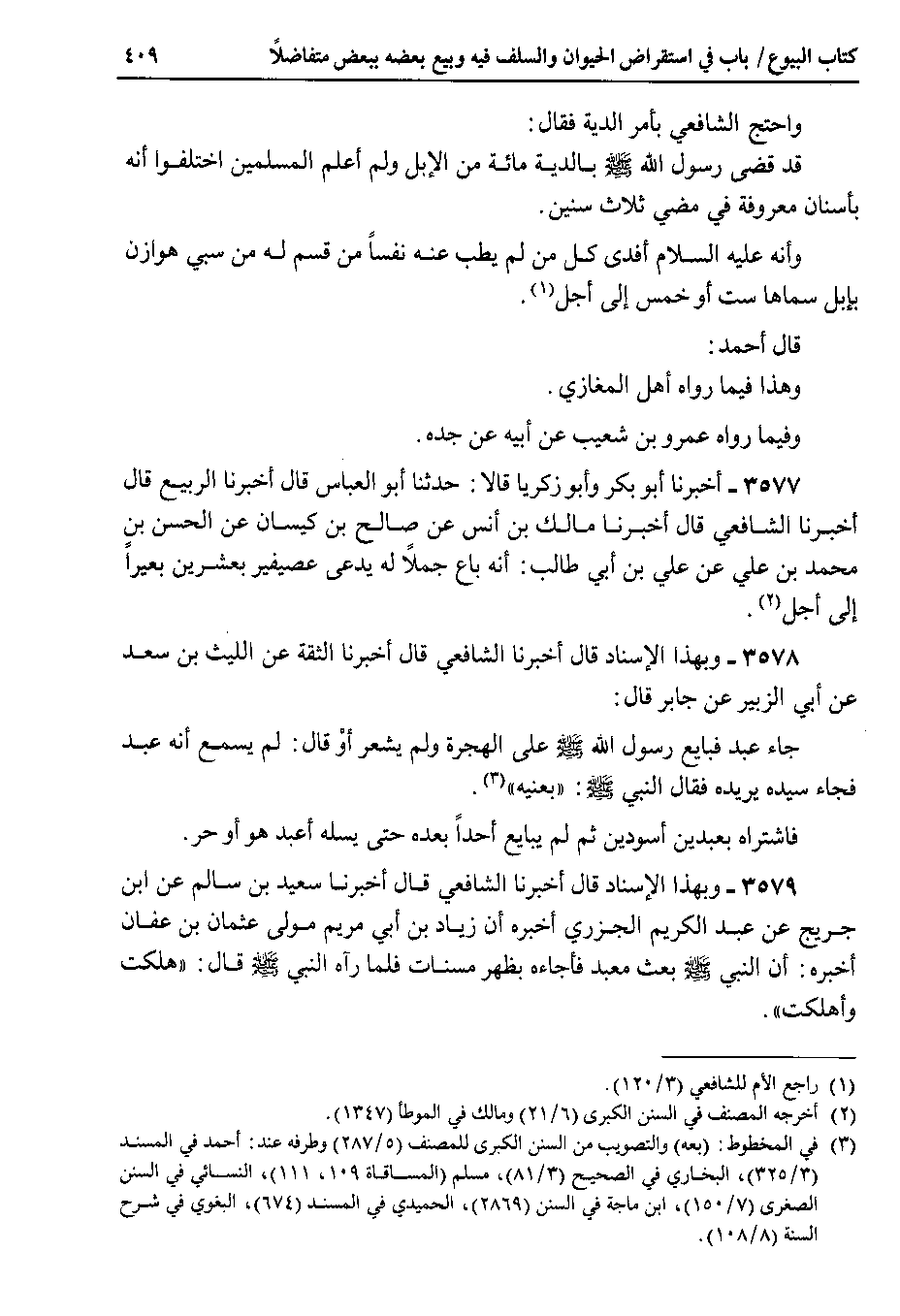 3577 - أخبرنا أبو بكر وأبو زكريا قالا : حدثنا أبو العباس قال أخبرنا الربيع قال أخبرنا الشافعي قال أخبرنا مالك بن أنس عن صالح بن كيسان عن الحسن بن محمد بن علي عن علي بن أبي طالب : أنه باع جملاً له يدعى عصيفير بعشرين بعيراً إلى أجل.