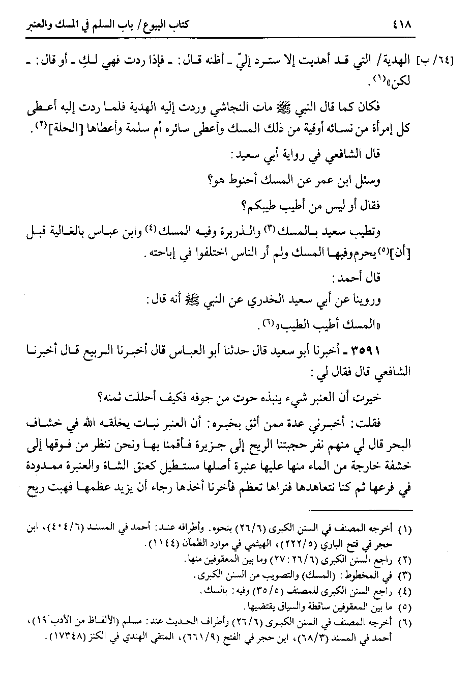 3591 - أخبرنا أبو سعيد قال حدثنا أبو العباس قال أخبرنا الربيع قال أخبرنا الشافعي قال فقال لي خيرت أن العنبر شيء ينبذه حوت من جوفه فكيف أحللت ثمنه ؟ فقلت : أخبرني عدة ممن أثق بخبره : أن العنبر نبات يخلقه الله في خشاف البحر قال لي منهم نفر حجبتنا الريح إلى جزيرة فأقمنا بها ونحن ننظر من فوقها إلى خشفة خارجة من الماء منها عليها عنبرة أصلها مستطيل كعنق الشاة والعنبرة ممدودة في فرعها ثم كنا نتعاهدها فنراها تعظم فأخرنا أخذها رجاء أن يزيد عظمها فهبت ريح