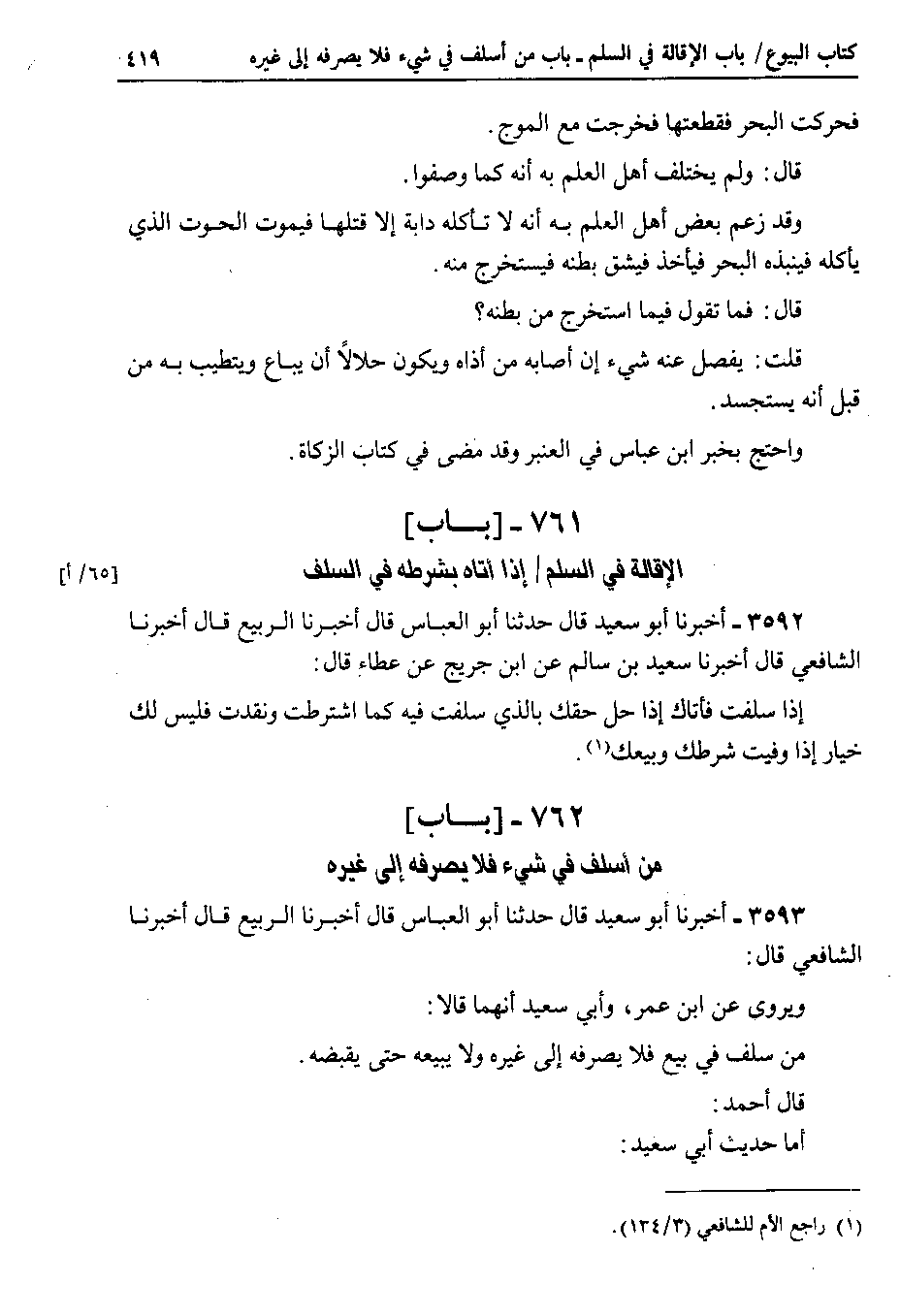 3593 - أخبرنا أبو سعيد قال حدثنا أبو العباس قال أخبرنا الربيع قال أخبرنا الشافعي قال ويروى عن ابن عمر ، وأبي سعيد أنهما قالا من سلف في بيع فلا يصرفه إلى غيره ولا يبيعه حتى يقبضه.
