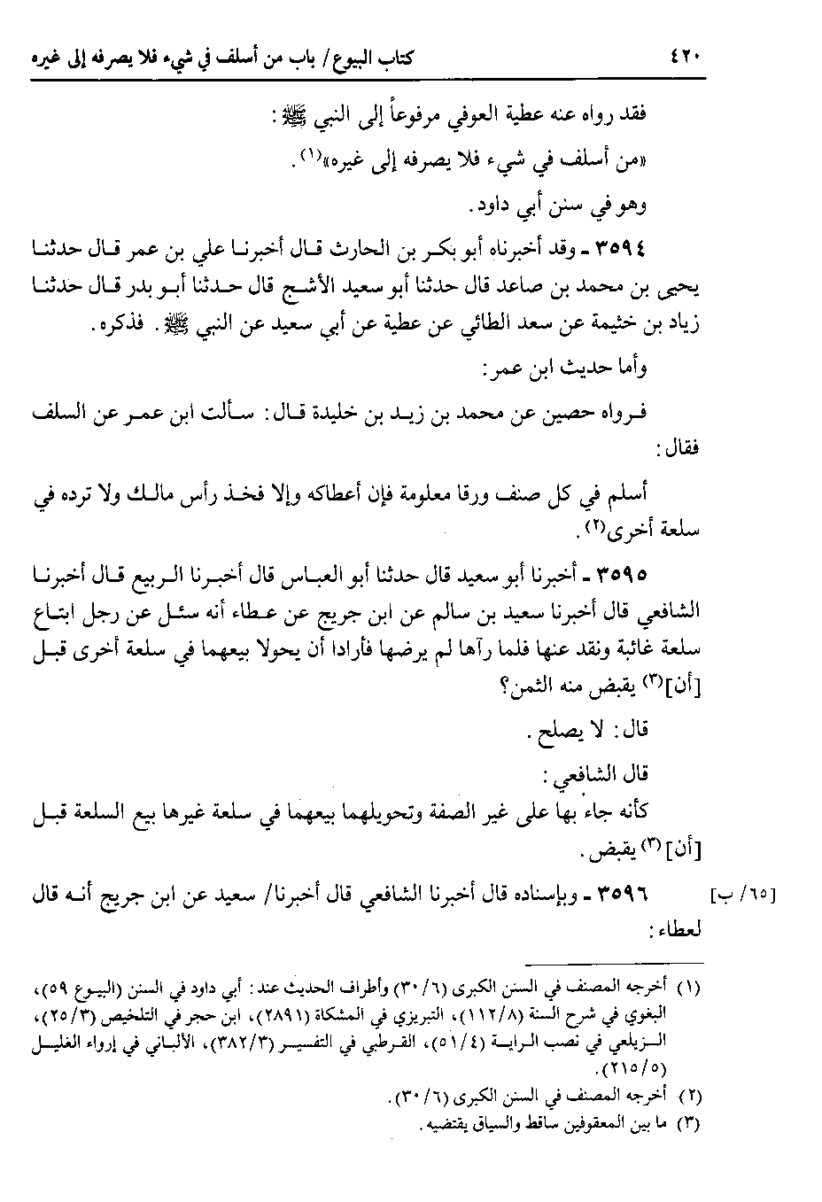 3594 - وقد أخبرناه أبو بكر بن الحارث قال أخبرنا علي بن عمر قال حدثنا يحيى بن محمد بن صاعد قال حدثنا أبو سعيد الأشج قال حدثنا أبو بدر قال حدثنا زياد بن خثيمة عن سعد الطائي عن عطية عن أبي سعيد عن النبي صلى الله عليه وسلم . فذكره وأما حديث ابن عمر فرواه حصين عن محمد بن زيد بن خليدة قال : سألت ابن عمر عن السلف فقال أسلم في كل صنف ورقا معلومة فإن أعطاكه وإلا فخذ رأس مالك ولا ترده في سلعة أخرى.