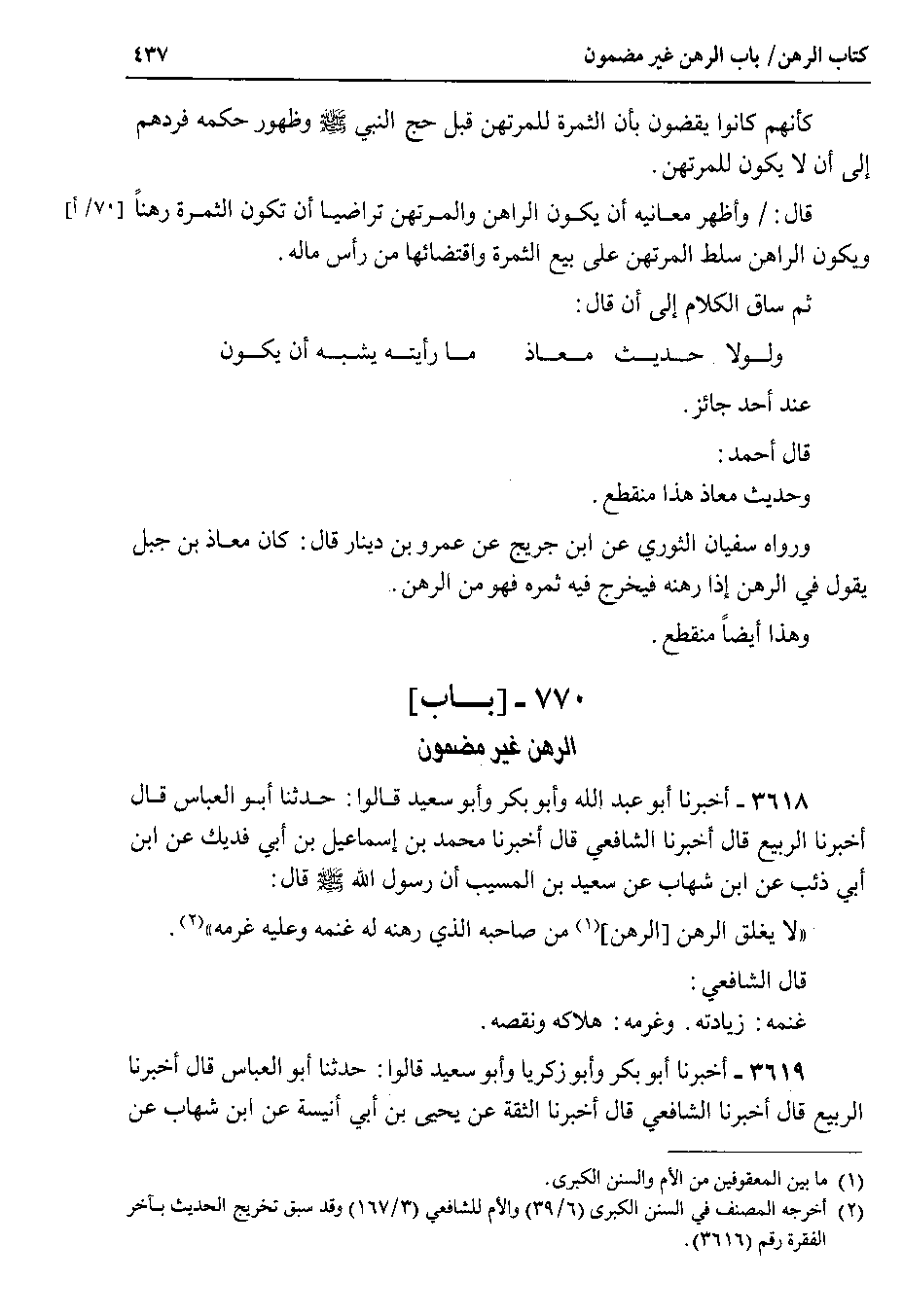 3618 - أخبرنا أبو عبد الله وأبو بكر وأبو سعيد قالوا : حدثنا أبو العباس قال أخبرنا الربيع قال أخبرنا الشافعي قال أخبرنا محمد بن إسماعيل بن أبي فديك عن ابن أبي ذئب عن ابن شهاب عن سعيد بن المسيب أن رسول الله صلى الله عليه وسلم قال لا يغلق الرهن الرهن من صاحبه الذي رهنه له غنمه وعليه غرمه.