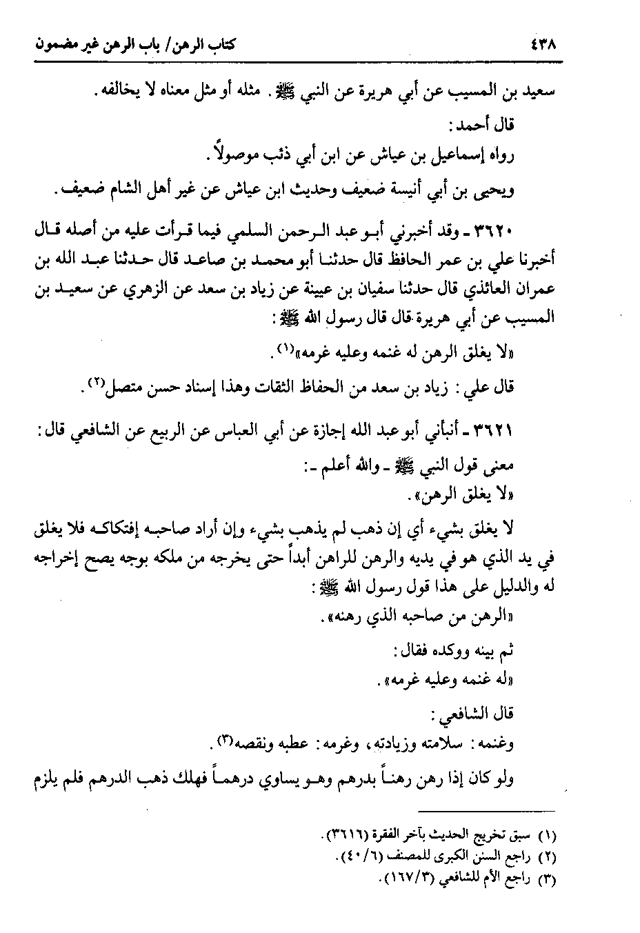 3620 - وقد أخبرني أبو عبد الرحمن السلمي فيما قرأت عليه من أصله قال أخبرنا علي بن عمر الحافظ قال حدثنا أبو محمد بن صاعد قال حدثنا عبد الله بن عمران العائذي قال حدثنا سفيان بن عيينة عن زياد بن سعد عن الزهري عن سعيد بن المسيب عن أبي هريرة قال قال رسول الله صلى الله عليه وسلم لا يغلق الرهن له غنمه وعليه غرمه.