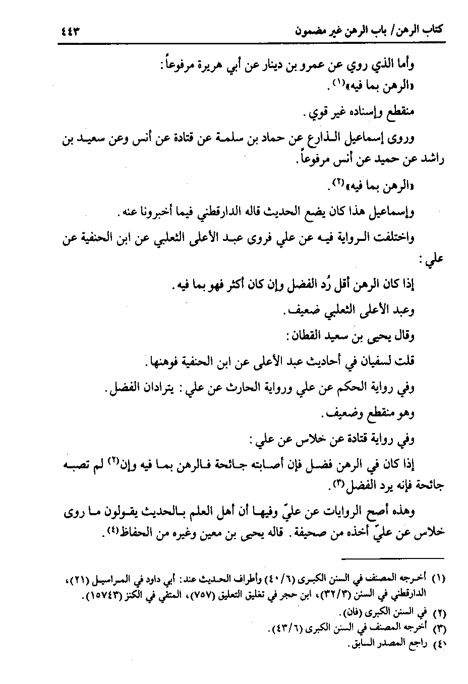 واختلفت الرواية فيه عن علي فروى عبد الأعلى الثعلبي عن ابن الحنيفة عن علي إذا كان الرهن أقل رد الفضل وإن كان أكثر فهو بما فيه.