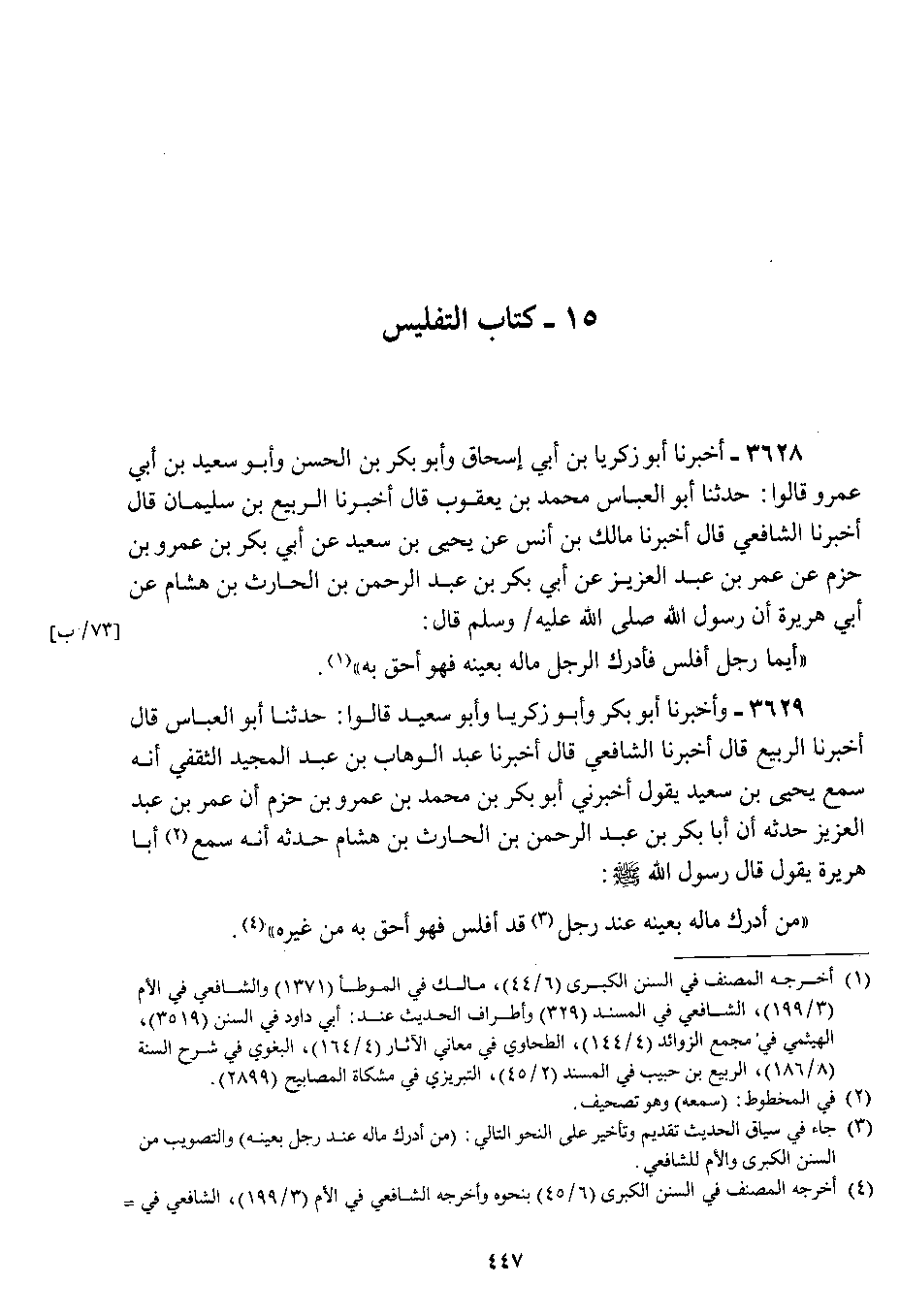 3628 - أخبرنا أبو زكريا بن أبي إسحاق وأبو بكر بن الحسن وأبو سعيد بن أبي عمرو قالوا : حدثنا أبو العباس محمد بن يعقوب قال أخبرنا الربيع بن سليمان قال أخبرنا الشافعي قال أخبرنا مالك بن أنس عن يحيى بن سعيد عن أبي بكر بن عمرو بن حزم عن عمر بن عبد العزيز عن أبي بكر بن عبد الرحمن بن الحارث بن هشام عن أبي هريرة أن رسول الله صلى الله عليه وسلم قال أيما رجل أفلس فأدرك الرجل ماله بعينه فهو أحق به.
