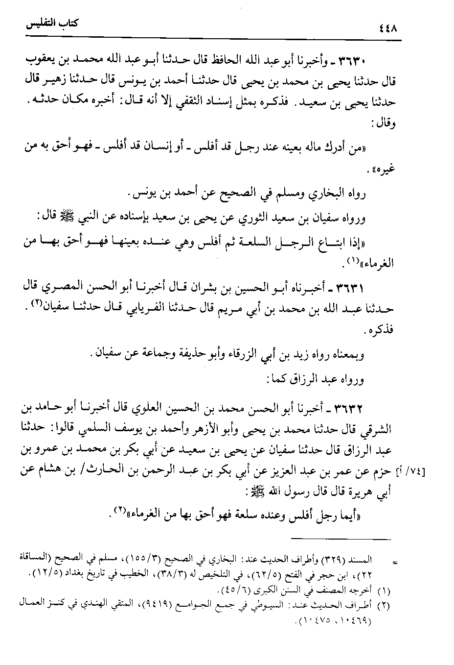 3630 - وأخبرنا أبو عبد الله الحافظ قال حدثنا أبو عبد الله محمد بن يعقوب قال حدثنا يحيى بن محمد بن يحيى قال حدثنا أحمد بن يونس قال حدثنا زهير قال حدثنا يحيى بن سعيد . فذكره بمثل إسناد الثقفي إلا أنه قال : أخبره مكان حدثه . وقال من أدرك ماله بعينه عند رجل قد أفلس _ أو إنسان قد أفلس _ فهو أحق به من غيره.