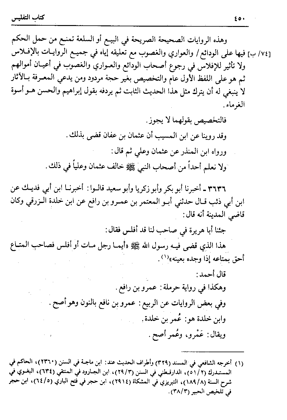 وهذه الروايات الصحيحة الصريحة في البيع أو السلعة تمنع من حمل الحكم فيها على الودائع والعواري والغصوب مع تعليقه إياه في جميع الروايات بالإفلاس ولا تأثير للإفلاس في رجوع أصحاب الودائع والعواري والغصوب في أعيان أموالهم ثم هو على اللفظ الأول عام والتخصيص بغير حجة مردود ومن يدعي المعرفة بالآثار لا ينبغي له أن يترك مثل هذا الحديث الثابت ثم يردفه بقول إبراهيم والحسن هو أسوة الغرماء.