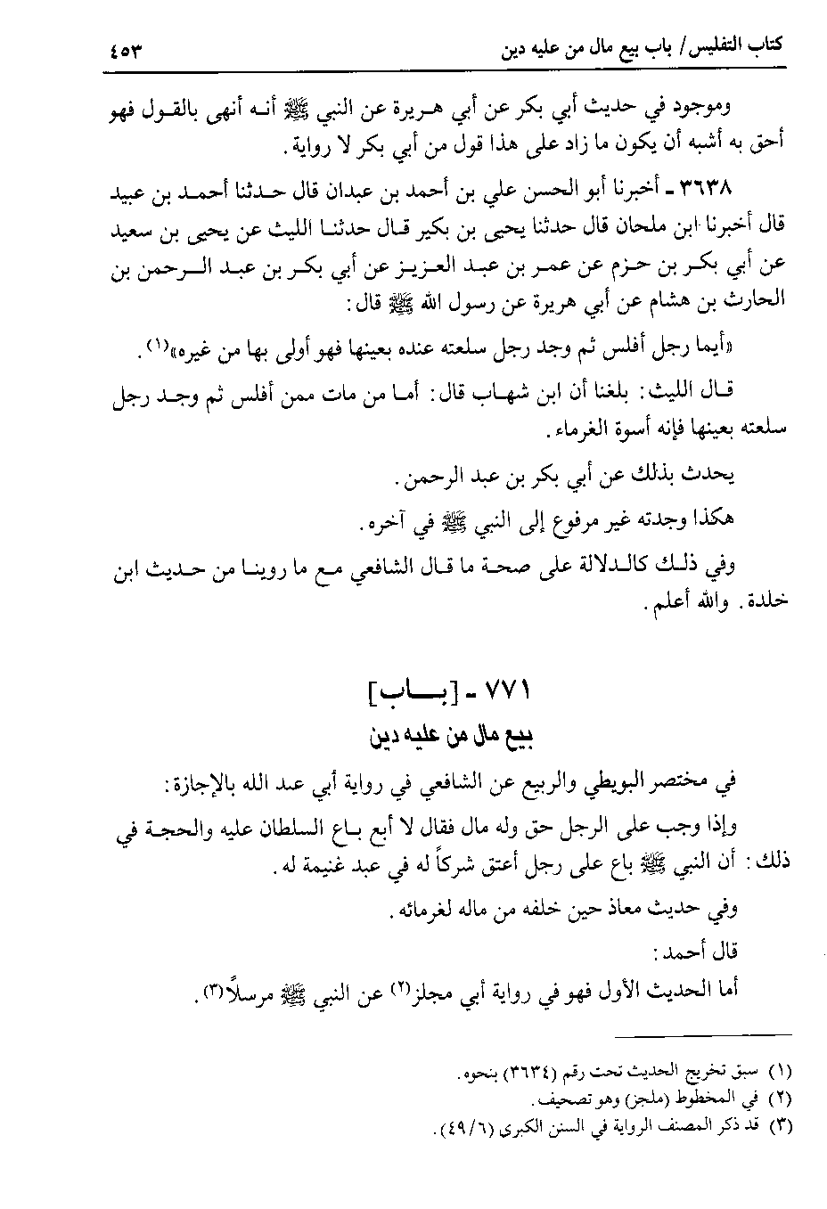 3638 - أخبرنا أبو الحسن علي بن أحمد بن عبدان قال حدثنا أحمد بن عبيد قال أخبرنا ابن ملحان قال حدثنا يحيى بن بكير قال حدثنا الليث عن يحيى بن سعيد عن أبي بكر بن حزم عن عمر بن عبد العزيز عن أبي بكر بن عبد الرحمن بن الحارث بن هشام عن أبي هريرة عن رسول الله صلى الله عليه وسلم قال أيما رجل أفلس ثم وجد رجل سلعته عنده بعينها فهو أولى بها من غيره.