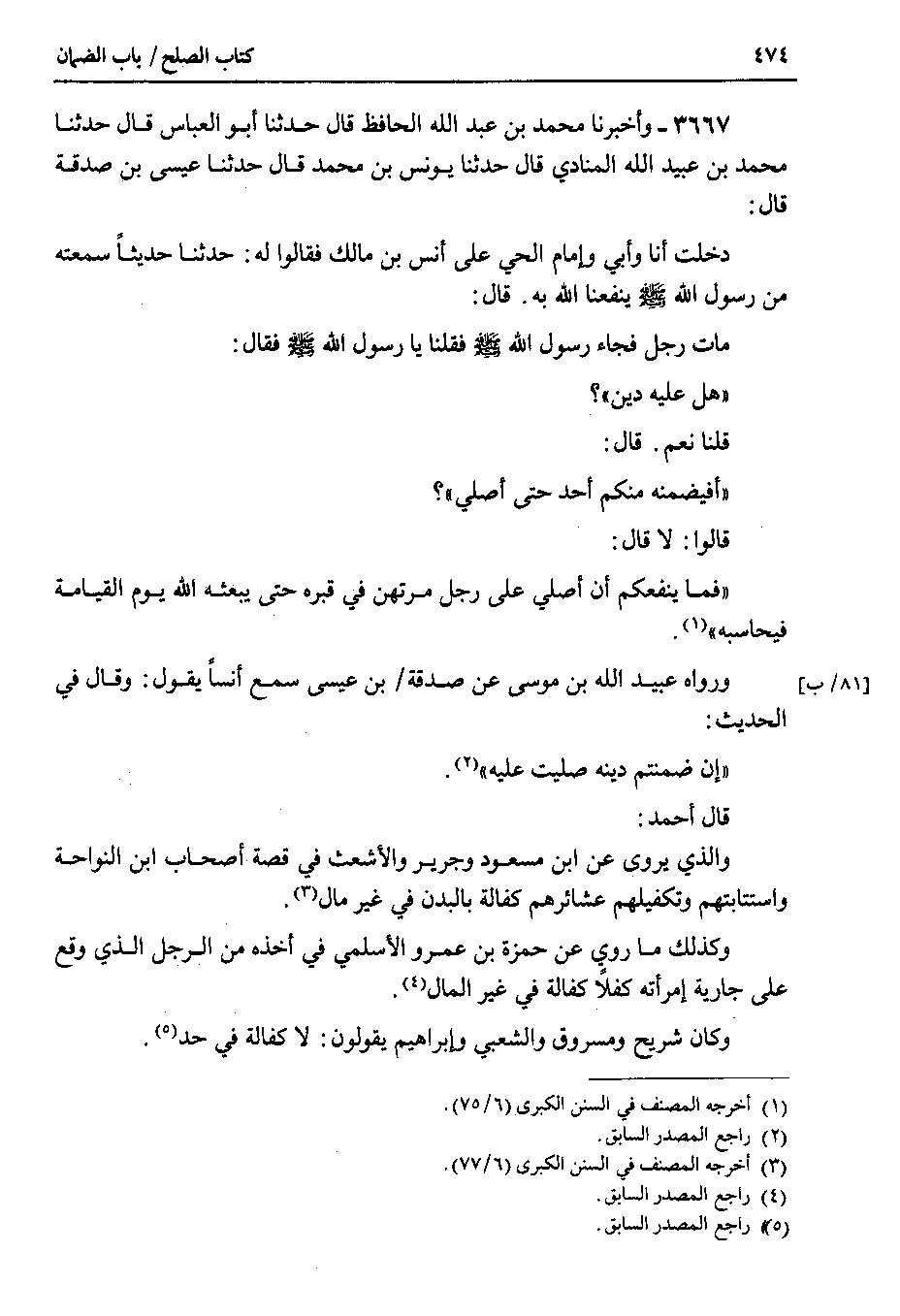 3667 - وأخبرنا محمد بن عبد الله الحافظ قال حدثنا أبو العباس قال حدثنا محمد بن عبيد الله المنادي قال حدثنا يونس بن محمد قال حدثنا عيسى بن صدقة قال دخلت أنا وأبي وإمام الحي على أنس بن مالك فقالوا له : حدثنا حديثاً سمعته من رسول الله صلى الله عليه وسلم ينفعنا الله به . قال مات رجل فجاء رسول الله صلى الله عليه وسلم فقلنا يا رسول الله صلى الله عليه وسلم فقال هل عليه دين ؟ قلنا نعم . قال أفيضمنه منكم أحد حتى أصلي ؟ قالوا : لا قال فما ينفعكم أن أصلي على رجل مرتهن في قبره حتى يبعثه الله يوم القيامة فيحاسبه.