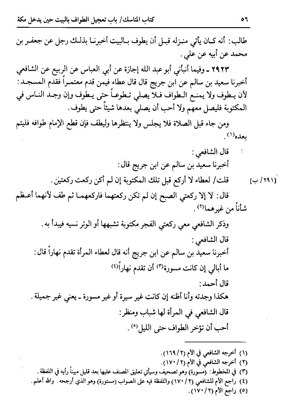 2923 - وفيما أنبأني أبو عبد الله إجازة عن أبي العباس عن الربيع عن الشافعي أخبرنا سعيد بن سالم عن ابن جريج قال قال عطاء فيمن قدم معتمراً فقدم المسجد : لأن يطوف ولا يمنع الطواف فلا يصلي تطوعاً حتى يطوف وإن وجد الناس في المكتوبة فليصل معهم ولا أحب أن يصلي بعدها شيئاً حتى يطوف.
