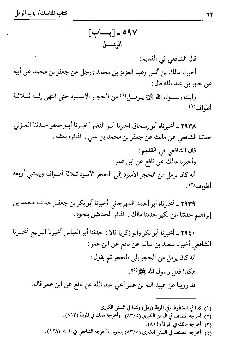 قال الشافعي في القديم وأخبرنا مالك عن نافع عن ابن عمر أنه كان يرمل من الحجر الأسود إلى الحجر الأسود ثلاثة أطواف ويمشي أربعة أطواف.
