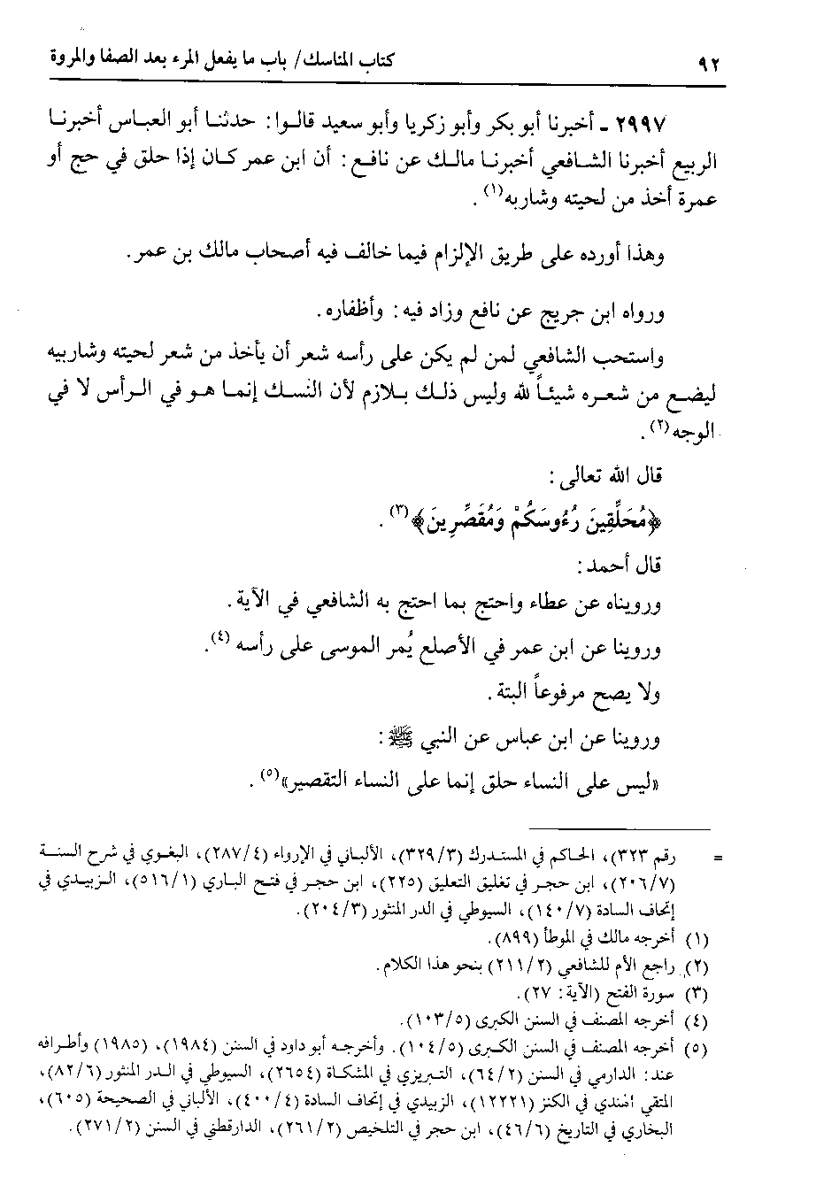 2997 - أخبرنا أبو بكر وأبو زكريا وأبو سعيد قالوا : حدثنا أبو العباس أخبرنا الربيع أخبرنا الشافعي أخبرنا مالك عن نافع : أن ابن عمر كان إذا حلق في حج أو عمرة أخذ من لحيته وشاربه.