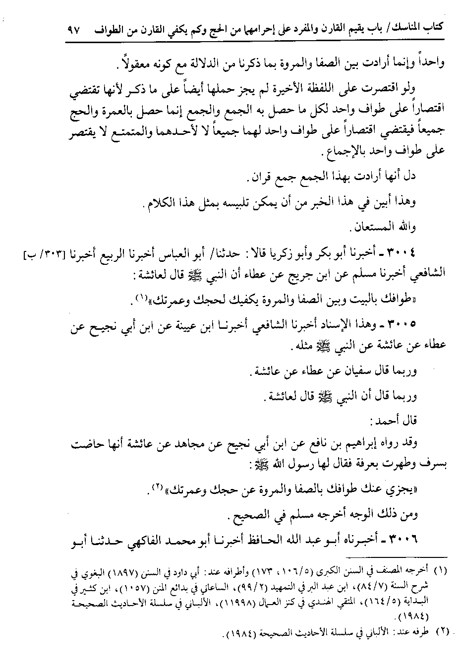 3004 - أخبرنا أبو بكر وأبو زكريا قالا : حدثنا أبو العباس أخبرنا الربيع أخبرنا الشافعي أخبرنا مسلم عن ابن جريج عن عطاء أن النبي صلى الله عليه وسلم قال لعائشة طوافك بالبيت وبين الصفا والمروة يكفيك لحجك وعمرتك.