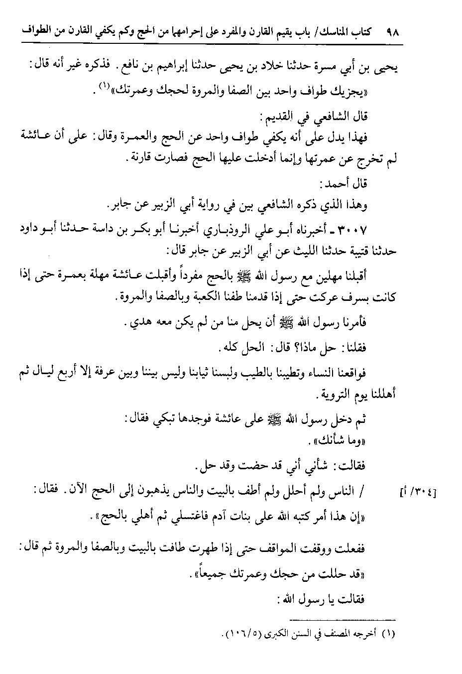 3007 - أخبرناه أبو علي الروذباري أخبرنا أبو بكر بن داسة حدثنا أبو داود حدثنا قتيبة حدثنا الليث عن أبي الزبير عن جابر قال أقبلنا مهلين مع رسول الله صلى الله عليه وسلم بالحج مفرداً وأقبلت عائشة مهلة بعمرة حتى إذا كانت بسرف عركت حتى إذا قدمنا طفنا الكعبة وبالصفا والمروة.