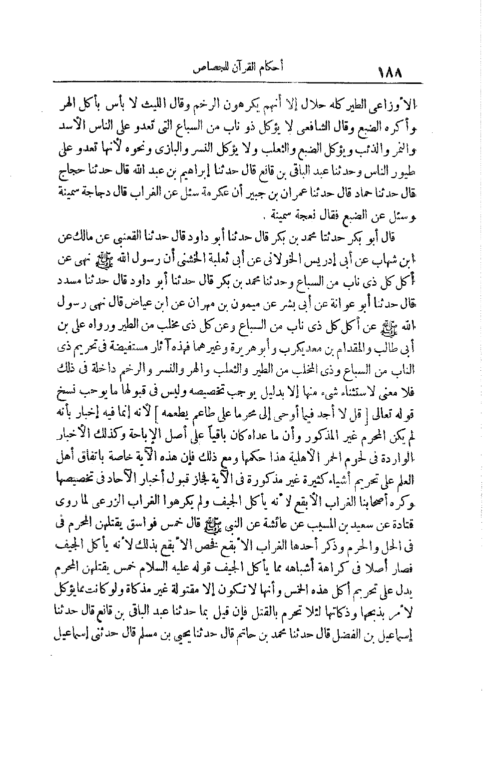 والمقدام بن معد يكرب وَأَبُو هُرَيْرَةَ وَغَيْرُهُمَا فَهَذِهِ آثَارٌ مُسْتَفِيضَةٌ فِي تَحْرِيمِ ذِي النَّابِ مِنْ السِّبَاعِ وَذِي الْمِخْلَبِ مِنْ الطَّيْرِ وَالثَّعْلَبِ وَالْهِرِّ وَالنِّسْرِ وَالرَّخْمُ دَاخِلَةٌ فِي ذَلِكَ فَلَا مَعْنَى لِاسْتِثْنَاءِ شَيْءِ مِنْهَا إلَّا بِدَلِيلٍ يُوجِبُ تَخْصِيصَهُ وَلَيْسَ فِي قَبُولِهَا مَا يُوجِبُ نَسْخَ قَوْله تَعَالَى قُلْ لا أَجِدُ فِي مَا أُوحِيَ إِلَيَّ مُحَرَّمًا عَلَى طاعم يطعمه لِأَنَّهُ إنَّمَا فِيهِ إخْبَارٌ بِأَنَّهُ لَمْ يَكُنْ الْمُحَرَّمُ غَيْرَ الْمَذْكُورِ وَأَنَّ مَا عَدَاهُ كَانَ بَاقِيًا عَلَى أَصْلِ الْإِبَاحَةِ وَكَذَلِكَ الْأَخْبَارُ الْوَارِدَةُ فِي لُحُومِ الْحُمُرِ الْأَهْلِيَّةِ هَذَا حُكْمُهَا وَمَعَ ذَلِكَ فَإِنَّ هَذِهِ الْآيَةَ خَاصَّةٌ بِاتِّفَاقِ أَهْلِ الْعِلْمِ عَلَى تَحْرِيمِ أَشْيَاءَ كَثِيرَةٍ غَيْرِ مَذْكُورَةٍ في الآية فجاز قبول أخبار الْآحَادِ فِي تَخْصِيصِهَا وَكَرِهَ أَصْحَابُنَا الْغُرَابَ الْأَبْقَعَ لِأَنَّهُ يَأْكُلُ الْجِيَفَ وَلَمْ يَكْرَهُوا الْغُرَابَ الزَّرْعِيَّ لِمَا رَوَى