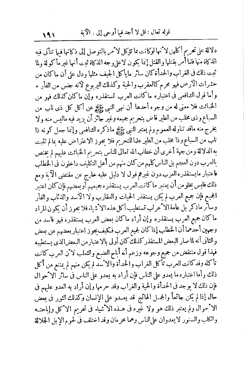 دَلَالَةٌ عَلَى تَحْرِيمِ أَكْلِهِنَّ لِأَنَّهَا لَوْ كَانَتْ مِمَّا تُؤْكَلُ لَأَمَرَ بِالتَّوَصُّلِ إلَى ذَكَاتِهَا فِيمَا تَتَأَتَّى فِيهِ الذَّكَاةُ مِنْهَا فَلَمَّا أَمَرَ بِقَتْلِهَا وَالْقَتْلُ إنَّمَا يَكُونُ لَا عَلَى وَجْهِ الذَّكَاةِ ثَبَتَ أَنَّهَا غَيْرُ مَأْكُولَةٍ وَلَمَّا ثَبَتَ ذَلِكَ فِي الْغُرَابِ وَالْحِدَأَةِ كَانَ سَائِرُ مَا يَأْكُلُ الْجِيَفَ مِثْلَهَا وَدَلَّ عَلَى أَنَّ مَا كَانَ مِنْ حَشَرَاتِ الْأَرْضِ فَهُوَ مُحَرَّمٌ كَالْعَقْرَبِ وَالْحَيَّةِ وَكَذَلِكَ الْيَرْبُوعُ لِأَنَّهُ جِنْسٌ مِنْ الْفَأْرِ وَأَمَّا قَوْلُ الشَّافِعِيِّ فِي اعْتِبَارِهِ مَا كَانَتْ الْعَرَبُ تَسْتَقْذِرُهُ وَأَنَّ مَا كَانَ كَذَلِكَ فَهُوَ مِنْ الْخَبَائِثِ فَلَا مَعْنَى لَهُ مِنْ وُجُوهٍ أَحَدُهَا أن نهى النبي صلّى اللَّه عليه وآله وَسَلَّمَ عَنْ أَكْلِ كُلِّ ذِي نَابٍ مِنْ السِّبَاعِ وَذِي مِخْلَبٍ مِنْ الطَّيْرِ قَاضٍ بِتَحْرِيمِ جَمِيعِهِ وَغَيْرُ جَائِزٍ أَنْ يَزِيدَ فِيهِ مَا لَيْسَ مِنْهُ وَلَا يَخْرُجُ مِنْهُ مَا قَدْ تَنَاوَلَهُ الْعُمُومُ وَلَمْ يَعْتَبِرْ النَّبِيُّ صَلَّى اللَّه عليه وآله وَسَلَّمَ مَا ذَكَرَهُ الشَّافِعِيُّ وَإِنَّمَا جَعَلَ كَوْنَهُ ذا تاب مِنْ السِّبَاعِ وَذَا مِخْلَبٍ مِنْ الطَّيْرِ عِلْمًا لِلتَّحْرِيمِ فَلَا يَجُوزُ الِاعْتِرَاضُ عَلَيْهِ بِمَا لَمْ تَثْبُتْ بِهِ الدَّلَالَةُ وَمِنْ جِهَةٍ أُخْرَى أَنَّ خِطَابَ اللَّه تَعَالَى لِلنَّاسِ بِتَحْرِيمِ الْخَبَائِثِ عَلَيْهِمْ لَمْ يَخْتَصَّ بِالْعَرَبِ دُونَ الْعَجَمِ بَلْ النَّاسُ كُلُّهُمْ مَنْ كَانَ مِنْهُمْ مِنْ أَهْلِ التَّكْلِيفِ دَاخِلُونَ فِي الْخِطَابِ فَاعْتِبَارُ مَا يَسْتَقْذِرُهُ الْعَرَبُ دُونَ غَيْرِهِمْ قَوْلٌ لَا دَلِيلَ عَلَيْهِ خَارِجٌ عَنْ مُقْتَضَى الْآيَةِ وَمَعَ ذَلِكَ فَلَيْسَ يَخْلُو من أن يعتبر ما كانت العرب يستقذره جَمِيعُهُمْ أَوْ بَعْضُهُمْ فَإِنْ كَانَ اُعْتُبِرَ الْجَمِيعُ فَإِنَّ جَمِيعَ الْعَرَبِ لَمْ يَكُنْ يَسْتَقْذِرُ الْحَيَّاتِ وَالْعَقَارِبَ وَلَا الْأَسَدَ وَالذِّئَابَ وَالْفَأْرَ وَسَائِرَ مَا ذُكِرَ بَلْ عَامَّةُ الْأَعْرَابِ تَسْتَطِيبُ أَكْلَ هَذِهِ الْأَشْيَاءِ فَلَا يَجُوزُ أَنْ يَكُونَ الْمُرَادُ مَا كان جميع العرب يستقذره وَإِنْ أَرَادَ مَا كَانَ بَعْضُ الْعَرَبِ يَسْتَقْذِرُهُ فَهُوَ فَاسِدٌ مِنْ وَجْهَيْنِ أَحَدُهُمَا أَنَّ الْخِطَابَ إذَا كَانَ لِجَمِيعِ الْعَرَبِ فَكَيْفَ يَجُوزُ اعْتِبَارُ بعضهم عن بَعْضٍ وَالثَّانِي أَنَّهُ لَمَّا صَارَ الْبَعْضُ الْمُسْتَقْذَرُ كَذَلِكَ كَانَ أَوْلَى بِالِاعْتِبَارِ مِنْ الْبَعْضِ الَّذِي يَسْتَطِيبُهُ فَهَذَا قَوْلٌ مُنْتَقِضٌ مِنْ جَمِيعِ وُجُوهِهِ وَزَعَمَ أَنَّهُ أَبَاحَ الضَّبُعَ وَالثَّعْلَبَ لِأَنَّ الْعَرَبَ كَانَتْ تَأْكُلُهُ وَقَدْ كَانَتْ الْعَرَبُ تَأْكُلُ الْغُرَابَ والحدأة والأسد لم يكن منهم لم يَمْتَنِعُ مِنْ أَكْلِ ذَلِكَ وَأَمَّا اعْتِبَارُهُ مَا يَعْدُو عَلَى النَّاسِ فَإِنْ أَرَادَ بِهِ يَعْدُو عَلَى النَّاسِ فِي سَائِرِ الْأَحْوَالِ فَإِنَّ ذَلِكَ لَا يُوجَدُ فِي الْحِدَأَةِ وَالْحَيَّةِ وَالْغُرَابِ وَقَدْ حَرَّمَهَا وَإِنْ أَرَادَ بِهِ الْعَدْوَ عَلَيْهِمْ فِي حَالِ إذَا لَمْ يَكُنْ جَائِعًا وَالْجَمَلُ الْهَائِجُ قَدْ يَعْدُو عَلَى الْإِنْسَانِ وَكَذَلِكَ الثَّوْرُ فِي بَعْضِ الْأَحْوَالِ وَلَمْ يَعْتَبِرْ ذَلِكَ هُوَ وَلَا غَيْرُهُ فِي هَذِهِ الْأَشْيَاءِ فِي تَحْرِيمِ الْأَكْلِ وإباحته والكلب السنور لَا يَعْدُوَانِ عَلَى النَّاسِ وَهُمَا مُحَرَّمَانِ وَقَدْ اختلف في لحوم الإبل الجلالة