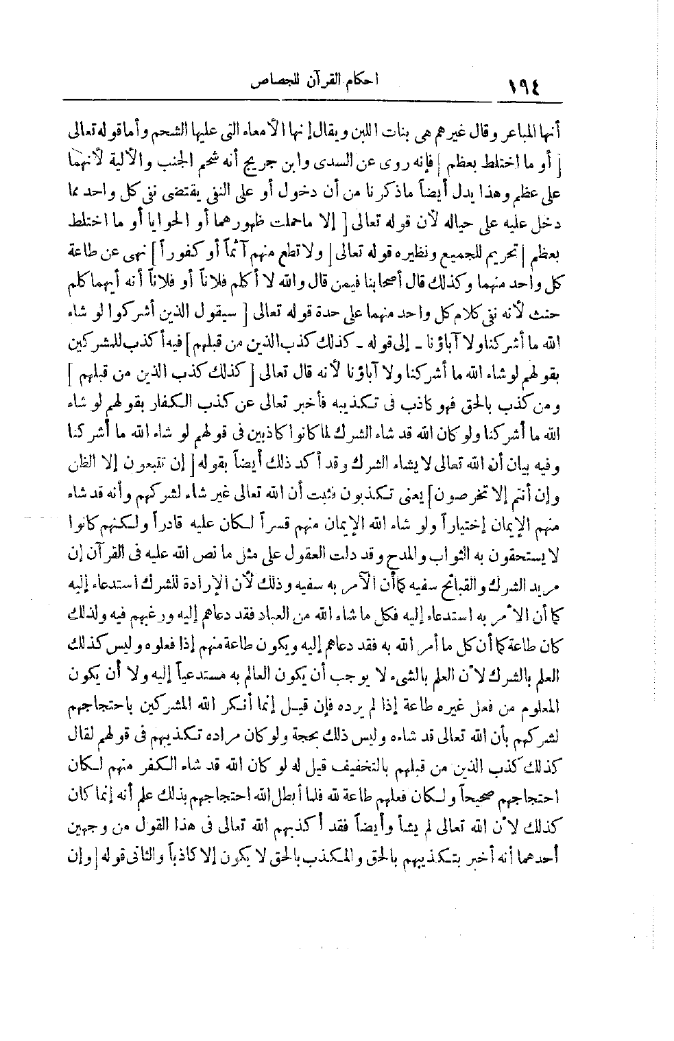 قَوْله تَعَالَى سَيَقُولُ الَّذِينَ أَشْرَكُوا لَوْ شاء الله ما أشركنا ولا آباؤنا- إلَى قَوْلِهِ- كَذَلِكَ كَذَّبَ الَّذِينَ مِنْ قَبْلِهِمْ فيه أكذب لِلْمُشْرِكِينَ بِقَوْلِهِمْ لَوْ شَاءَ اللَّه مَا أَشْرَكْنَا ولا آباؤنا لِأَنَّهُ قَالَ تَعَالَى كَذَلِكَ كَذَّبَ الَّذِينَ مِنْ قبلهم وَمَنْ كَذَّبَ بِالْحَقِّ فَهُوَ كَاذِبٌ فِي تَكْذِيبِهِ فَأَخْبَرَ تَعَالَى عَنْ كَذِبِ الْكُفَّارِ بِقَوْلِهِمْ لَوْ شاء اللَّه ما أشركنا وَلَوْ كَانَ اللَّه قَدْ شَاءَ الشِّرْكَ لَمَا كَانُوا كَاذِبِينَ فِي قَوْلِهِمْ لَوْ شَاءَ اللَّه ما أشركنا وَفِيهِ بَيَانٌ أَنَّ اللَّه تَعَالَى لَا يَشَاءُ الشِّرْكَ وَقَدْ أَكَّدَ ذَلِكَ أَيْضًا بِقَوْلِهِ إِنْ تَتَّبِعُونَ إِلا الظَّنَّ وَإِنْ أَنْتُمْ إِلا تَخْرُصُونَ يَعْنِي تَكْذِبُونَ فَثَبَتَ أَنَّ اللَّه تَعَالَى غَيْرُ شَاءٍ لِشِرْكِهِمْ وَأَنَّهُ قَدْ شَاءَ مِنْهُمْ الْإِيمَانَ اخْتِيَارًا وَلَوْ شَاءَ اللَّه الْإِيمَانَ مِنْهُمْ قَسْرًا لَكَانَ عَلَيْهِ قَادِرًا وَلَكِنَّهُمْ كَانُوا لَا يَسْتَحِقُّونَ بِهِ الثَّوَابَ وَالْمَدْحَ وَقَدْ دَلَّتْ الْعُقُولُ عَلَى مِثْلِ مَا نَصَّ اللَّه عَلَيْهِ فِي الْقُرْآنِ أَنَّ مُرِيدَ الشِّرْكِ وَالْقَبَائِحِ سَفِيهٌ كَمَا أَنَّ الْآمِرَ بِهِ سَفِيهٌ وَذَلِكَ لِأَنَّ الْإِرَادَةَ لِلشِّرْكِ اسْتِدْعَاءٌ إلَيْهِ كَمَا أَنَّ الْأَمْرَ بِهِ اسْتِدْعَاءٌ إليه فكل ما شاء اللَّه مِنْ الْعِبَادِ فَقَدْ دَعَاهُمْ إلَيْهِ وَرَغَّبَهُمْ فِيهِ وَلِذَلِكَ كَانَ طَاعَةً كَمَا أَنَّ كُلَّ مَا أَمَرَ اللَّه بِهِ فَقَدْ دَعَاهُمْ إلَيْهِ وَيَكُونُ طَاعَةً مِنْهُمْ إذَا فَعَلُوهُ وَلَيْسَ كَذَلِكَ الْعِلْمُ بِالشِّرْكِ لِأَنَّ الْعِلْمَ بِالشَّيْءِ لَا يُوجِبُ أَنْ يَكُونَ الْعَالِمُ بِهِ مُسْتَدْعِيًا إلَيْهِ وَلَا أَنْ يَكُونَ الْمَعْلُومُ مِنْ فِعْلِ غَيْرِهِ طَاعَةً إذَا لَمْ يَرُدَّهُ فَإِنْ قِيلَ إنَّمَا أَنْكَرَ اللَّه الْمُشْرِكِينَ بِاحْتِجَاجِهِمْ لِشِرْكِهِمْ بِأَنَّ اللَّه تَعَالَى قَدْ شَاءَهُ وَلَيْسَ ذَلِكَ بِحُجَّةٍ وَلَوْ كَانَ مُرَادُهُ تَكْذِيبَهُمْ فِي قَوْلِهِمْ لَقَالَ كَذَلِكَ كَذَبَ الَّذِينَ مِنْ قَبْلِهِمْ بِالتَّخْفِيفِ قِيلَ لَهُ لَوْ كَانَ اللَّه قَدْ شَاءَ الْكُفْرَ مِنْهُمْ لَكَانَ احْتِجَاجُهُمْ صَحِيحًا وَلَكَانَ فِعْلُهُمْ طَاعَةً للَّه فَلَمَّا أَبْطَلَ اللَّه احْتِجَاجَهُمْ بِذَلِكَ عُلِمَ أَنَّهُ إنَّمَا كَانَ كَذَلِكَ لِأَنَّ اللَّه تَعَالَى لَمْ يَشَأْ وَأَيْضًا فَقَدْ أَكْذَبَهُمْ اللَّه تَعَالَى فِي هَذَا الْقَوْلِ مِنْ وَجْهَيْنِ أَحَدُهُمَا أَنَّهُ أَخْبَرَ بِتَكْذِيبِهِمْ بِالْحَقِّ وَالْمُكَذِّبُ بِالْحَقِّ لَا يَكُونُ إلَّا كَاذِبًا وَالثَّانِي قوله