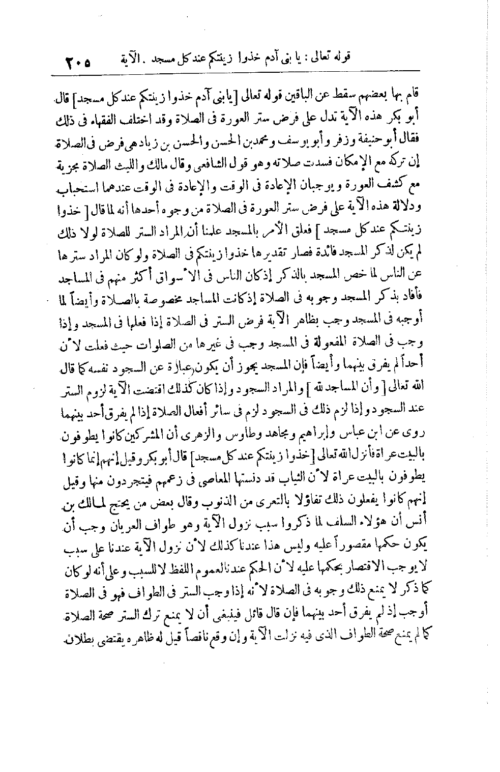 قَوْله تَعَالَى يَا بَنِي آدَمَ خُذُوا زِينَتَكُمْ عِنْدَ كل مسجد قَالَ أَبُو بَكْرٍ هَذِهِ الْآيَةُ تَدُلُّ عَلَى فَرْضِ سَتْرِ الْعَوْرَةِ فِي الصَّلَاةِ وَقَدْ اخْتَلَفَ الْفُقَهَاءُ فِي ذَلِكَ فَقَالَ أَبُو حَنِيفَةَ وَزُفَرُ وَأَبُو يُوسُفَ وَمُحَمَّدُ بْنُ الْحَسَنِ وَالْحَسَنُ بْنُ زِيَادٍ هِيَ فَرْضٌ فِي الصَّلَاةِ إنْ تَرَكَهُ مَعَ الْإِمْكَانِ فَسَدَتْ صَلَاتُهُ وَهُوَ قَوْلُ الشَّافِعِيِّ وَقَالَ مَالِكٌ وَاللَّيْثُ الصَّلَاةُ مُجْزِيَةٌ مَعَ كَشْفِ الْعَوْرَةِ وَيُوجِبَانِ الْإِعَادَةَ فِي الْوَقْتِ وَالْإِعَادَةُ فِي الْوَقْتِ عِنْدَهُمَا اسْتِحْبَابٌ وَدَلَالَةُ هَذِهِ الْآيَةِ عَلَى فَرْضِ سِتْرِ الْعَوْرَةِ فِي الصَّلَاةِ مِنْ وُجُوهٍ أَحَدُهَا أَنَّهُ لَمَّا قَالَ خُذُوا زِينَتَكُمْ عِنْدَ كل مسجد فَعَلَّقَ الْأَمْرَ بِالْمَسْجِدِ عَلِمْنَا أَنَّ الْمُرَادَ السَّتْرُ لِلصَّلَاةِ لَوْلَا ذَلِكَ لَمْ يَكُنْ لِذِكْرِ الْمَسْجِدِ فَائِدَةٌ فَصَارَ تَقْدِيرُهَا خُذُوا زِينَتَكُمْ فِي الصَّلَاةِ وَلَوْ كَانَ الْمُرَادُ سَتْرَهَا عَنْ النَّاسِ لَمَا خَصَّ الْمَسْجِدَ بِالذِّكْرِ إذْ كَانَ النَّاسُ فِي الْأَسْوَاقِ أَكْثَرَ مِنْهُمْ فِي الْمَسَاجِدِ فَأَفَادَ بِذِكْرِ المسجد وجوبه في الصلاة إذا كَانَتْ الْمَسَاجِدُ مَخْصُوصَةً بِالصَّلَاةِ وَأَيْضًا لَمَّا أَوْجَبَهُ فِي الْمَسْجِدِ وَجَبَ بِظَاهِرِ الْآيَةِ فَرْضُ السَّتْرِ فِي الصَّلَاةِ إذَا فَعَلَهَا فِي الْمَسْجِدِ وَإِذَا وَجَبَ فِي الصَّلَاةِ الْمَفْعُولَةِ فِي الْمَسْجِدِ وَجَبَ فِي غَيْرِهَا مِنْ الصَّلَوَاتِ حَيْثُ فُعِلَتْ لِأَنَّ أَحَدًا لَمْ يُفَرِّقْ بَيْنَهُمَا وَأَيْضًا فَإِنَّ الْمَسْجِدَ يَجُوزُ أَنْ يَكُونَ عِبَارَةً عَنْ السُّجُودِ نَفْسِهِ كَمَا قَالَ اللَّه تَعَالَى وَأَنَّ الْمَسَاجِدَ لِلَّهِ وَالْمُرَادُ السُّجُودُ وَإِذَا كَانَ كَذَلِكَ اقْتَضَتْ الْآيَةُ لُزُومَ السَّتْرِ عِنْدَ السُّجُودِ وَإِذَا لَزِمَ ذَلِكَ فِي السُّجُودِ لَزِمَ فِي سَائِرِ أَفْعَالِ الصَّلَاةِ إذا لَمْ يُفَرِّقْ أَحَدٌ بَيْنَهُمَا رُوِيَ عَنْ ابْنِ عَبَّاسٍ وَإِبْرَاهِيمَ وَمُجَاهِدٍ وَطَاوُسٍ وَالزُّهْرِيِّ أَنَّ الْمُشْرِكِينَ كَانُوا يَطُوفُونَ بِالْبَيْتِ عُرَاةً فَأَنْزَلَ اللَّه تَعَالَى خذوا زينتكم عند كل مسجد قَالَ أَبُو بَكْرٍ وَقِيلَ إنَّهُمْ إنَّمَا كَانُوا يَطُوفُونَ بِالْبَيْتِ عُرَاةً لِأَنَّ الثِّيَابَ قَدْ دَنَّسَتْهَا الْمَعَاصِي فِي زَعْمِهِمْ فَيَتَجَرَّدُونَ مِنْهَا وَقِيلَ إنَّهُمْ كَانُوا يَفْعَلُونَ ذَلِكَ تَفَاؤُلًا بِالتَّعَرِّي مِنْ الذُّنُوبِ وَقَالَ بَعْضُ مَنْ يَحْتَجُّ لِمَالِكِ بْنِ أَنَسٍ إنَّ هَؤُلَاءِ السَّلَفَ لَمَّا ذَكَرُوا سَبَبَ نُزُولِ الْآيَةِ وَهُوَ طَوَافُ الْعُرْيَانِ وَجَبَ أَنْ يَكُونَ حُكْمُهَا مَقْصُورًا عَلَيْهِ وَلَيْسَ هَذَا عِنْدَنَا كَذَلِكَ لِأَنَّ نُزُولَ الْآيَةِ عِنْدَنَا عَلَى سَبَبٍ لَا يُوجِبُ الِاقْتِصَارَ بِحُكْمِهَا عَلَيْهِ لِأَنَّ الْحُكْمَ عِنْدَنَا لِعُمُومِ اللَّفْظِ لَا لِلسَّبَبِ وَعَلَى أَنَّهُ لَوْ كَانَ كَمَا ذُكِرَ لَا يَمْنَعُ ذَلِكَ وُجُوبَهُ فِي الصَّلَاةِ لِأَنَّهُ إذَا وَجَبَ السَّتْرُ فِي الطواف فهو في الصلاة وجب إذْ لَمْ يُفَرِّقْ أَحَدٌ بَيْنَهُمَا فَإِنْ قَالَ قَائِلٌ فَيَنْبَغِي أَنْ لَا يَمْنَعَ تَرْكُ السَّتْرِ صِحَّةَ الصَّلَاةِ كَمَا لَمْ يَمْنَعْ صِحَّةَ الطَّوَافِ الَّذِي فِيهِ نَزَلَتْ الْآيَةُ وَإِنْ وَقَعَ نَاقِصًا قِيلَ لَهُ ظَاهِرُهُ يَقْتَضِي بُطْلَانَ
